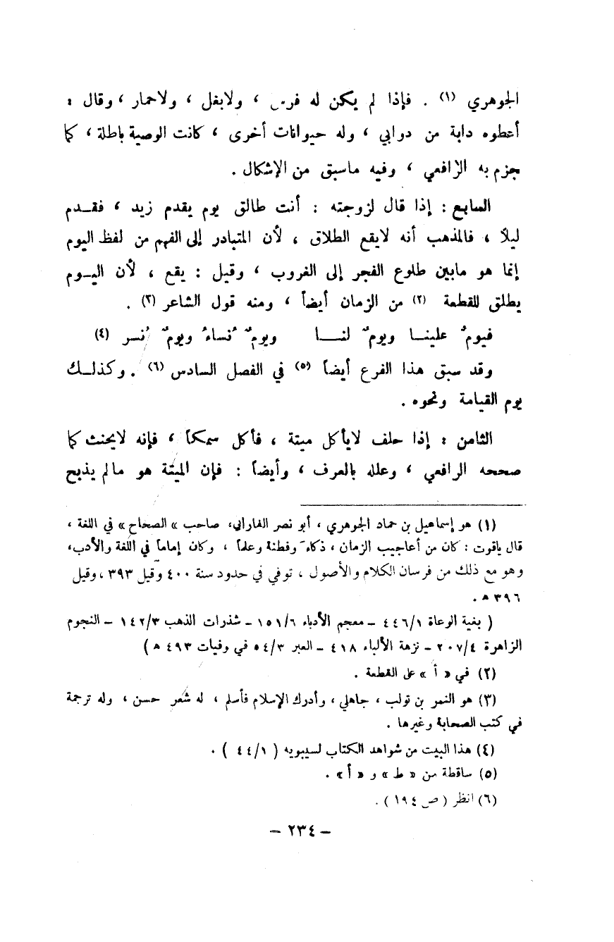 السَّابِع إِذا قَالَ لزوجته أَنْت طَالِق يَوْم يقدم زيد فَقدم لَيْلًا فَالْمَذْهَب أَنه لَا يَقع الطَّلَاق لِأَن الْمُتَبَادر إِلَى الْفَهم من لفظ الْيَوْم إِنَّمَا هُوَ مَا بَين طُلُوع الْفجْر إِلَى الْغُرُوب وَقيل يَقع لِأَن الْيَوْم يُطلق للقطعة من الزَّمَان أَيْضا وَمِنْه قَول الشَّاعِر