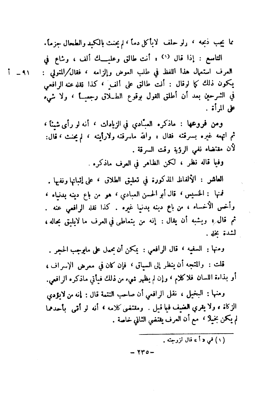 التَّاسِع إِذا قَالَ أَنْت طَالِق وَعَلَيْك ألف وشاع فِي الْعرف اسْتِعْمَال هَذَا اللَّفْظ فِي طلب الْعِوَض وإلزامه فَقَالَ الْمُتَوَلِي يكون ذَلِك كَمَا لَو قَالَ أَنْت طَالِق على ألف كَذَا نَقله عَنهُ الرَّافِعِيّ فِي الشرحين بعد أَن أطلق القَوْل بِوُقُوع الطَّلَاق رَجْعِيًا وَلَا شَيْء على الْمَرْأَة
