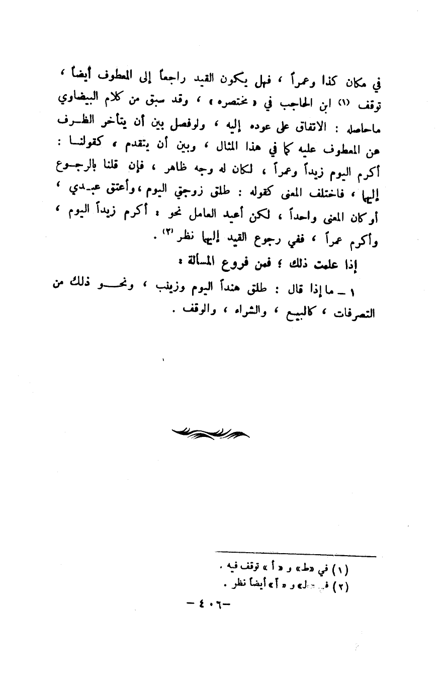 فِي مَكَان كَذَا وعمرا فَهَل يكون الْقَيْد رَاجعا إِلَى الْمَعْطُوف أَيْضا توقف ابْن الْحَاجِب فِي مُخْتَصره وَقد سبق من كَلَام الْبَيْضَاوِيّ مَا حَاصله الِاتِّفَاق على عوده إِلَيْهِ وَلَو فصل بَين أَن يتَأَخَّر الظّرْف عَن الْمَعْطُوف عَلَيْهِ كَمَا فِي هَذَا الْمِثَال وَبَين أَن يتَقَدَّم كَقَوْلِنَا أكْرم الْيَوْم زيدا وعمرا لَكَانَ لَهُ وَجه ظَاهر فَإِن قُلْنَا بِالرُّجُوعِ إِلَيْهِمَا فَاخْتلف الْمَعْنى كَقَوْلِه طلق زَوْجَتي الْيَوْم وَأعْتق عَبدِي أَو كَانَ الْمَعْنى وَاحِدًا لَكِن أُعِيد الْعَامِل نَحْو أكْرم زيدا الْيَوْم وَأكْرم عمرا فَفِي رُجُوع الْقَيْد إِلَيْهِمَا نظر