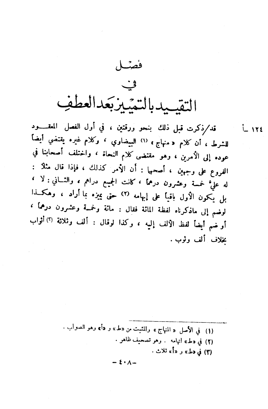 قد ذكرت قبل ذَلِك بِنَحْوِ ورقتين فِي أول الْفَصْل الْمَعْقُود للشّرط أَن كَلَام منهاج الْبَيْضَاوِيّ وَكَلَام غَيره يَقْتَضِي أَيْضا عوده إِلَى الْأَمريْنِ وَهُوَ مُقْتَضى كَلَام النُّحَاة وَاخْتلف أَصْحَابنَا فِي الْفُرُوع على وَجْهَيْن أصَحهمَا أَن الْأَمر كَذَلِك فَإِذا قَالَ مثلا لَهُ عَليّ خَمْسَة وَعِشْرُونَ درهما كَانَت الْجَمِيع دَرَاهِم وَالثَّانِي لَا بل يكون الأول بَاقِيا على إبهامه حَتَّى يميزه بِمَا اراد وَهَكَذَا لَو ضم إِلَى مَا ذَكرْنَاهُ لَفظه الْمِائَة فَقَالَ مائَة وَخَمْسَة وَعِشْرُونَ درهما أَو ضم أَيْضا لفظ الْألف إِلَيْهِ وَكَذَا لَو قَالَ ألف وَثَلَاثَة اثواب بِخِلَاف ألف وثوب