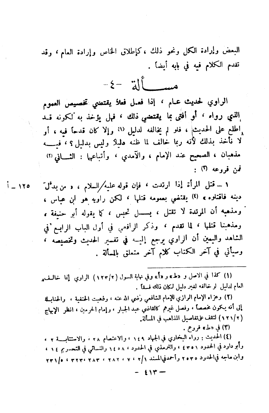 ١ - قتل الْمَرْأَة إِذا ارْتَدَّت فَإِن قَوْله عَلَيْهِ السَّلَام من بدل دينه فَاقْتُلُوهُ يَقْتَضِي بِعُمُومِهِ قَتلهَا لَكِن رَاوِيه هُوَ ابْن عَبَّاس ومذهبه أَن الْمُرْتَدَّة لَا تقتل بل تحبس كَمَا يَقُوله أَبُو حنيفَة ومذهبنا قَتلهَا لما تقدم وَذكر الرَّافِعِيّ فِي أول الْبَاب الرَّابِع فِي الشَّاهِد وَالْيَمِين أَن الرَّاوِي يرجع إِلَيْهِ فِي تَفْسِير الحَدِيث وتخصيصه وَسَيَأْتِي فِي آخر الْكتاب كَلَام آخر مُتَعَلق بِالْمَسْأَلَة