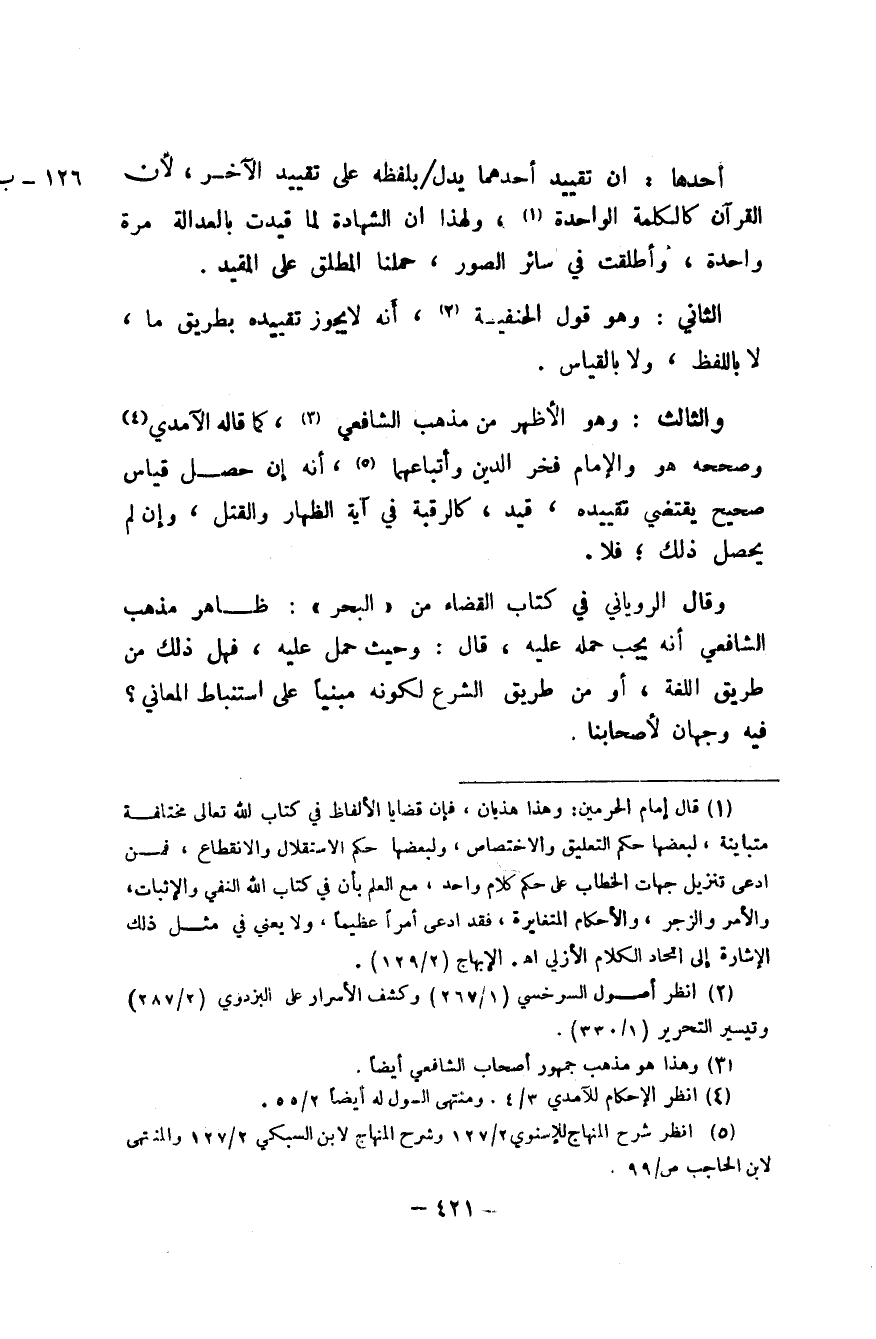 وَالثَّالِث وَهُوَ الْأَظْهر من مَذْهَب الشَّافِعِي كَمَا قَالَه الْآمِدِيّ وَصَححهُ هُوَ وَالْإِمَام فَخر الدّين وأتباعهما أَنه إِن حصل قِيَاس صَحِيح يَقْتَضِي تَقْيِيده قيد كالرقبة فِي آيَة الظِّهَار وَالْقَتْل وَإِن لم يحصل ذَلِك فَلَا