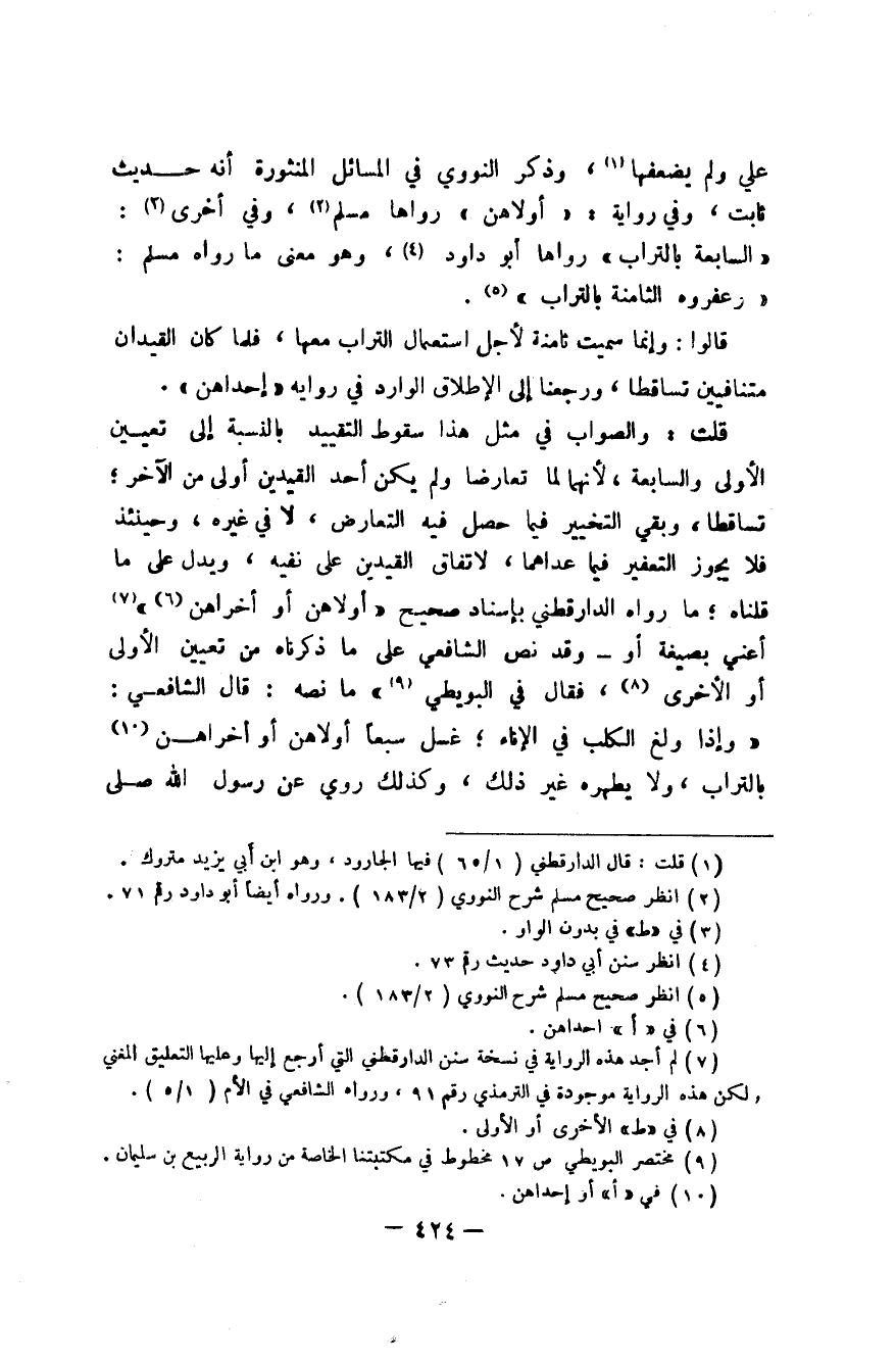 قلت وَالصَّوَاب فِي مثل هَذَا سُقُوط التَّقْيِيد بِالنِّسْبَةِ إِلَى تعْيين الأولى وَالسَّابِعَة لِأَنَّهُمَا لما تَعَارضا وَلم يكن أحد القيدين أولى من الآخر تساقطا وَبَقِي التَّخْيِير فِيمَا حصل فِيهِ التَّعَارُض لَا فِي غَيره وَحِينَئِذٍ فَلَا يجوز التعفير فِيمَا عَداهَا لِاتِّفَاق القيدين على نَفْيه وَيدل على مَا قُلْنَاهُ مَا رَوَاهُ الدَّارَقُطْنِيّ بِإِسْنَاد صَحِيح أولَاهُنَّ أَو أخراهن أَعنِي بِصِيغَة أَو وَقد نَص الشَّافِعِي على مَا ذَكرْنَاهُ من تعْيين الأولى أَو الْأُخْرَى فَقَالَ فِي الْبُوَيْطِيّ مَا نَصه قَالَ الشَّافِعِي وَإِذا ولغَ الْكَلْب فِي الْإِنَاء غسل سبعا أولَاهُنَّ أَو أخراهن بِالتُّرَابِ وَلَا يطهره غير ذَلِك وَكَذَلِكَ رُوِيَ عَن رَسُول الله صلى الله عَلَيْهِ وَسلم =