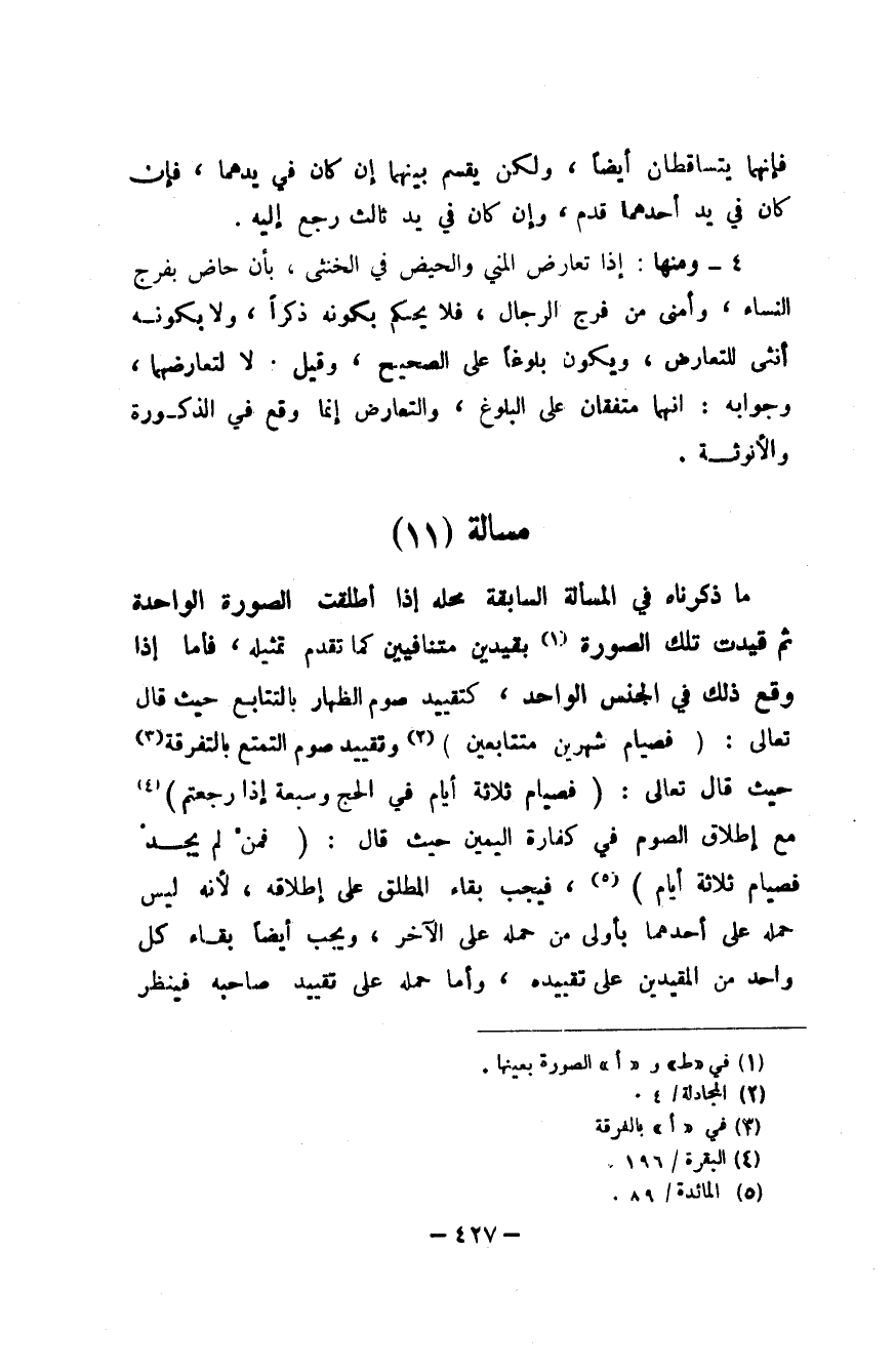 مَا ذَكرْنَاهُ فِي الْمَسْأَلَة السَّابِقَة مَحَله إِذا أطلقت الصُّورَة الْوَاحِدَة ثمَّ قيدت تِلْكَ الصُّورَة بقيدين متنافيين كَمَا تقدم تمثيله فَأَما إِذا وَقع ذَلِك فِي الْجِنْس الْوَاحِد كتقييد صَوْم الظِّهَار بالتتابع حَيْثُ قَالَ تَعَالَى {فَصِيَام شَهْرَيْن مُتَتَابعين} وَتَقْيِيد صَوْم التَّمَتُّع بالتفرقة حَيْثُ قَالَ تَعَالَى {فَصِيَام ثَلَاثَة أَيَّام فِي الْحَج وَسَبْعَة إِذا رجعتم} مَعَ إِطْلَاق الصَّوْم فِي كَفَّارَة الْيَمين حَيْثُ قَالَ {فَمن لم يجد فَصِيَام ثَلَاثَة أَيَّام} فَيجب بَقَاء الْمُطلق على إِطْلَاقه لِأَنَّهُ لَيْسَ حمله على أَحدهمَا بِأولى من حمله على الآخر وَيحيى أَيْضا بَقَاء كل وَاحِد من المقيدين على تَقْيِيده وَأما حمله على تَقْيِيد صَاحبه فَينْظر