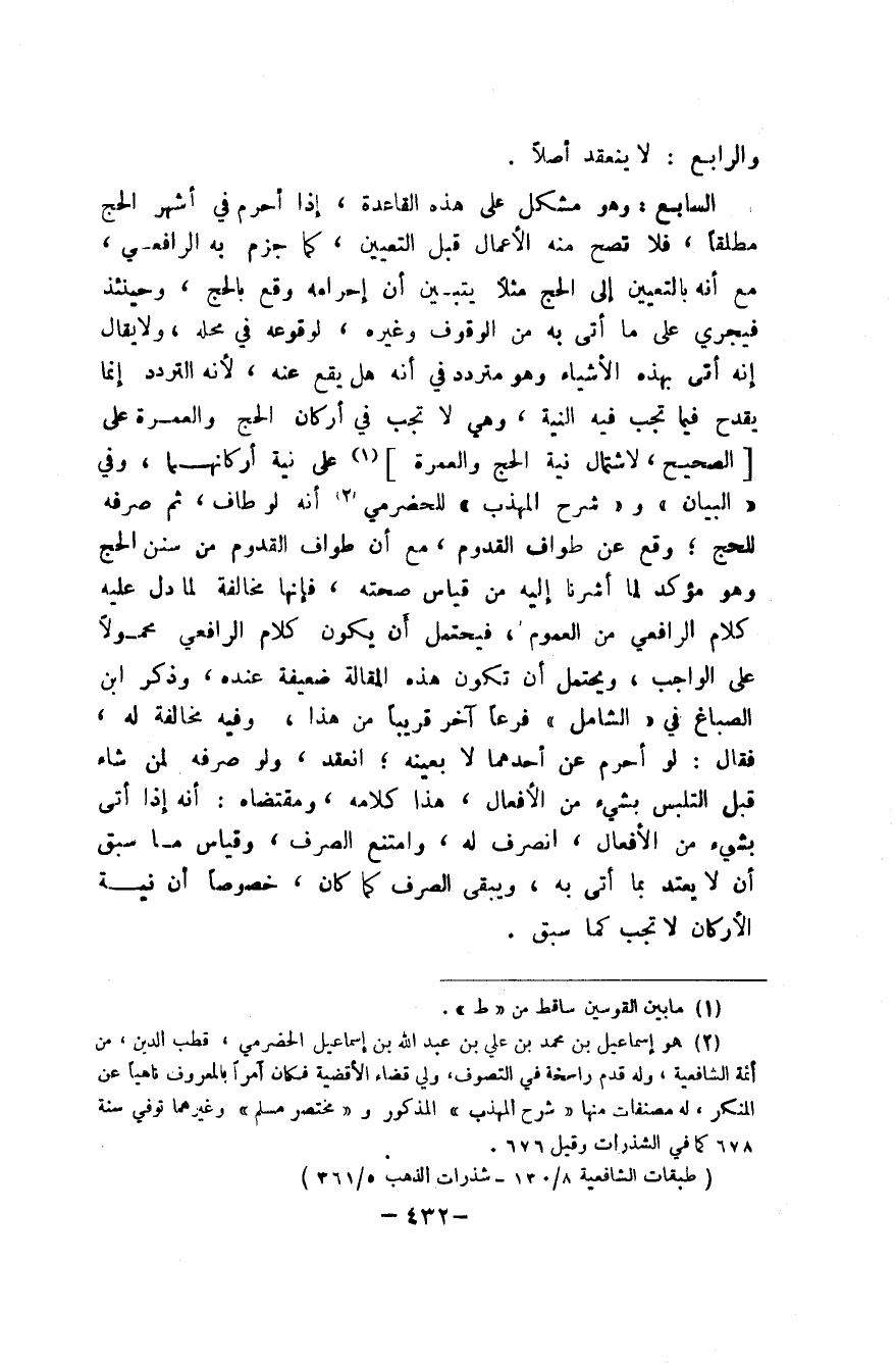 السَّابِع وَهُوَ مُشكل على هَذِه الْقَاعِدَة إِذا أحرم فِي أشهر الْحَج مُطلقًا فَلَا تصح مِنْهُ الْأَعْمَال قبل التَّعْيِين كَمَا جزم بِهِ الرَّافِعِيّ مَعَ أَنه بِالتَّعْيِينِ إِلَى الْحَج مثلا يتَبَيَّن أَن إِحْرَامه وَقع بِالْحَجِّ وَحِينَئِذٍ فَيجْرِي على مَا أَتَى بِهِ من الْوُقُوف وَغَيره لوُقُوعه فِي مَحَله وَلَا يُقَال إِنَّه أَتَى بِهَذِهِ الْأَشْيَاء وَهُوَ مُتَرَدّد فِي أَنه هَل يَقع عَنهُ لِأَنَّهُ التَّرَدُّد إِنَّمَا يقْدَح فِيمَا تجب فِيهِ النِّيَّة وَهِي لَا تجب فِي أَرْكَان الْحَج وَالْعمْرَة على الصَّحِيح لاشتمال نِيَّة الْحَج وَالْعمْرَة على نِيَّة أركانهما وَفِي الْبَيَان وَشرح الْمُهَذّب للحضرمي أَنه لَو طَاف ثمَّ صرفه لِلْحَجِّ وَقع على طواف الْقدوم مَعَ أَن طواف الْقدوم من سنَن الْحَج وَهُوَ مُؤَكد لما اشرنا إِلَيْهِ من قِيَاس صِحَّته فَإِنَّهَا مُخَالفَة لما دلّ عَلَيْهِ كَلَام الرَّافِعِيّ من الْعُمُوم فَيحْتَمل أَن يكون كَلَام الرَّافِعِيّ مَحْمُولا على الْوَاجِب وَيحْتَمل أَن تكون هَذِه الْمقَالة ضَعِيفَة عِنْده وَذكر ابْن الصّباغ فِي الشَّامِل فرعا آخر قَرِيبا من هَذَا وَفِيه مُخَالفَة لَهُ فَقَالَ لَو أحرم عَن أَحدهمَا لَا بِعَيْنِه انْعَقَد وَلَو صرفه لمن شَاءَ قبل التَّلَبُّس بِشَيْء من الْأَفْعَال هَذَا كَلَامه وَمُقْتَضَاهُ أَنه إِذا أَتَى بِشَيْء من الْأَفْعَال انْصَرف لَهُ وَامْتنع الصّرْف وَقِيَاس مَا سبق أَن لَا يعْتد بِمَا أَتَى بِهِ وَيبقى الصّرْف كَمَا كَانَ خُصُوصا أَن نِيَّة الْأَركان لَا تجب كَمَا سبق