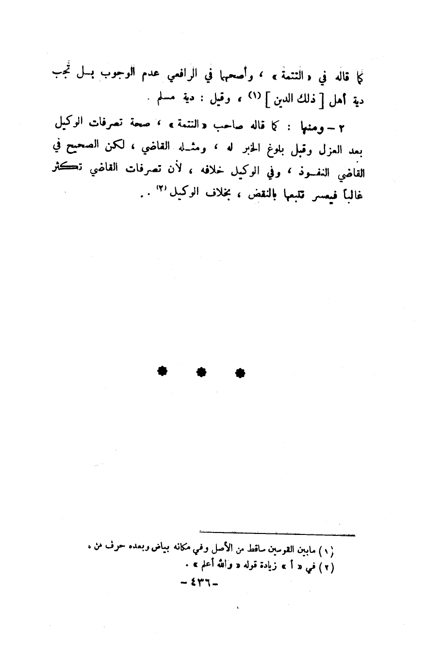 ٢ - وَمِنْهَا كَمَا قَالَه صَاحب التَّتِمَّة صِحَة تَصَرُّفَات الْوَكِيل بعد الْعَزْل وَقبل بُلُوغ الْخَبَر لَهُ وَمثله القَاضِي لَكِن الصَّحِيح فِي القَاضِي النّفُوذ وَفِي الْوَكِيل خِلَافه لِأَن تَصَرُّفَات القَاضِي تكْثر غَالِبا فيعسر تتبعها بِالنَّقْضِ بِخِلَاف الْوَكِيل