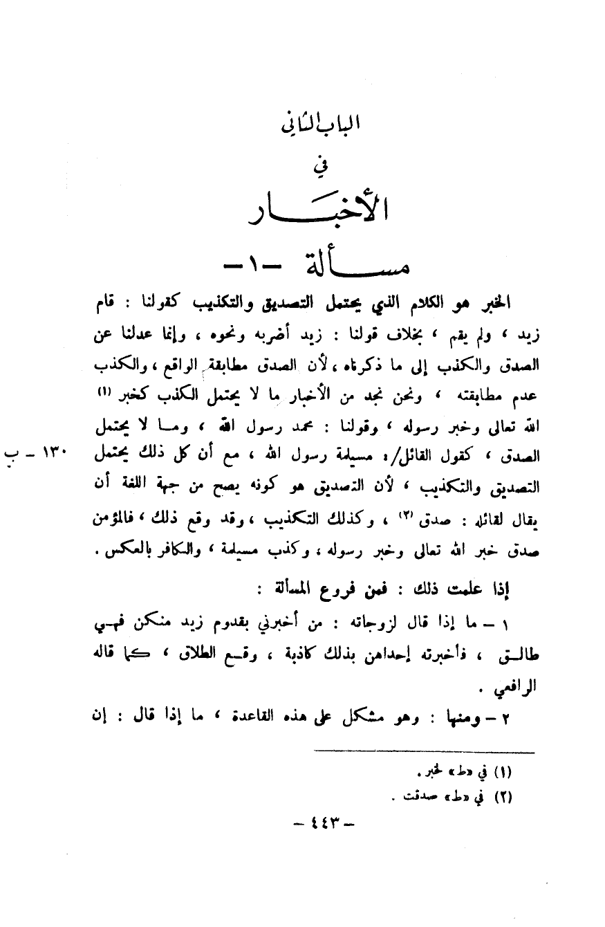 الْخَبَر هُوَ الْكَلَام الَّذِي يحْتَمل التَّصْدِيق والتكذيب كَقَوْلِنَا قَامَ زيد وَلم يقم بِخِلَاف قَوْلنَا زيد أضربه وَنَحْو وَإِنَّمَا عدلنا عَن الصدْق وَالْكذب إِلَى مَا ذَكرْنَاهُ لِأَن الصدْق مُطَابقَة الْوَاقِع وَالْكذب عدم مطابقته وَنحن نجد من الْأَخْبَار مَا لَا يحْتَمل الْكَذِب كَخَبَر الله تَعَالَى وَخبر رَسُوله وَقَوْلنَا مُحَمَّد رَسُول الله وَمَا لَا يحْتَمل الصدْق كَقَوْل الْقَائِل مُسَيْلمَة رَسُول الله مَعَ أَن كل ذَلِك يحْتَمل التَّصْدِيق والتكذيب لِأَن التَّصْدِيق هُوَ كَونه يَصح من جِهَة اللُّغَة أَن يُقَال لقائله صدق وَكَذَلِكَ التَّكْذِيب وَقد وَقع ذَلِك فالمؤمن صدق خبر الله تَعَالَى وَخبر رَسُوله وَكذب مُسَيْلمَة وَالْكَافِر بِالْعَكْسِ