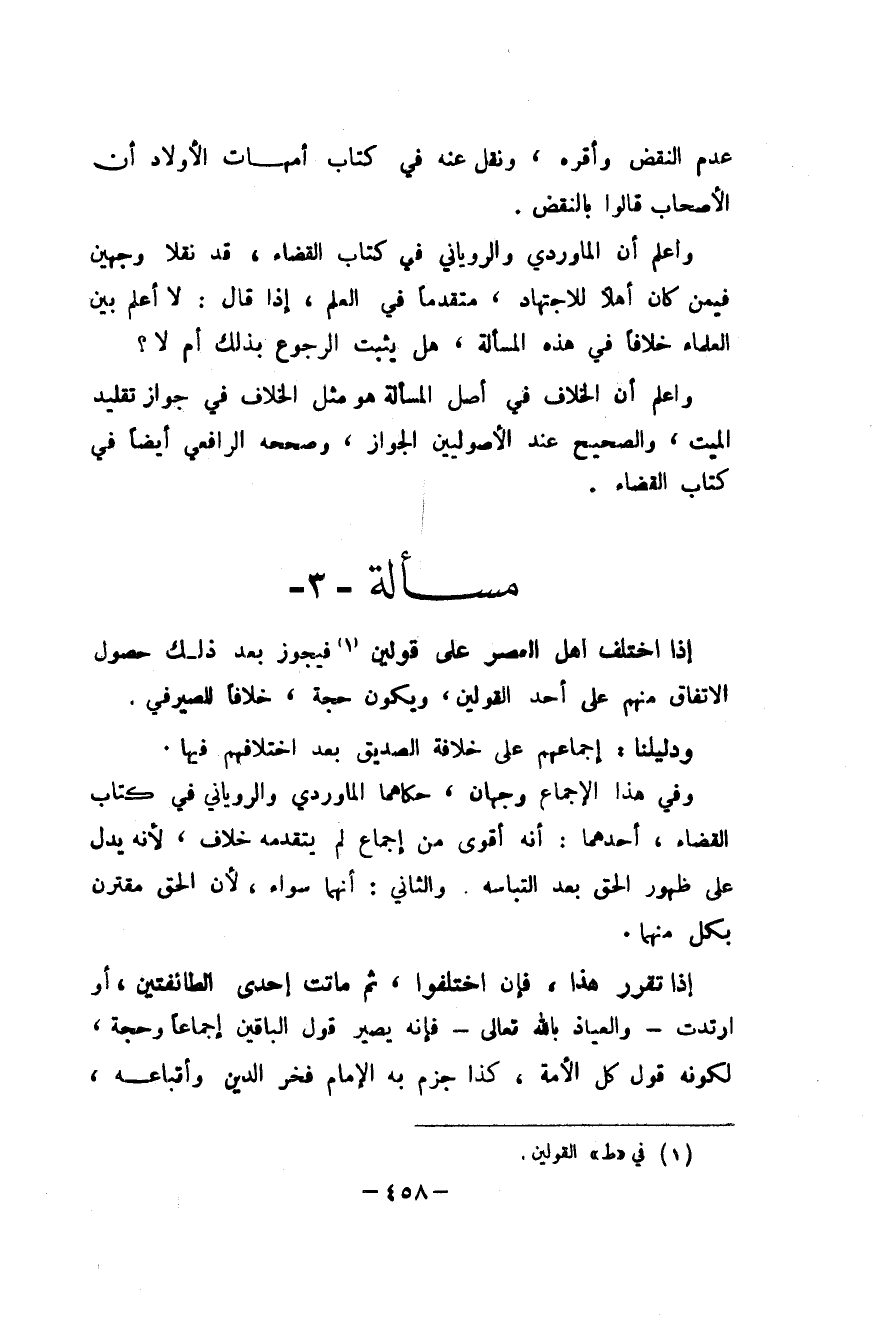 وَأعلم أَن الْمَاوَرْدِيّ وَالرُّويَانِيّ فِي كتاب الْقَضَاء قد نقلا وَجْهَيْن فِيمَن كَانَ أَهلا للِاجْتِهَاد مُتَقَدما فِي الْعلم إِذا قَالَ لَا أعلم بَين الْعلمَاء خلافًا فِي هَذِه الْمَسْأَلَة هَل يثبت الرُّجُوع بذلك أم لَا