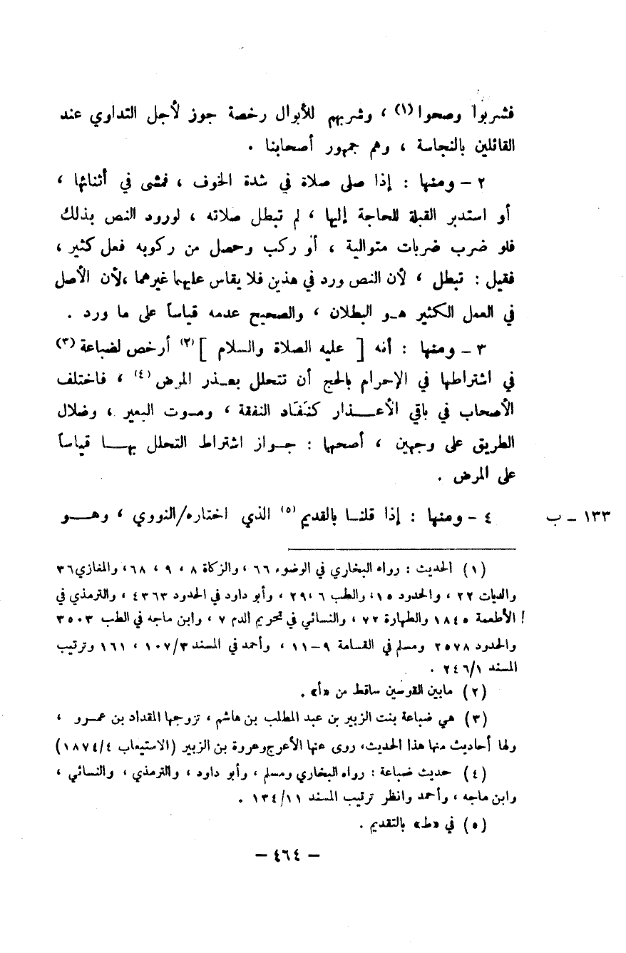 ٣ - وَمِنْهَا أَنه عَلَيْهِ الصَّلَاة وَالسَّلَام أرخص لضباعة فِي اشْتِرَاطهَا فِي الْإِحْرَام بِالْحَجِّ أَن تتحلل بِعُذْر الْمَرَض فَاخْتلف الْأَصْحَاب فِي بَاقِي الْأَعْذَار كنفاد النَّفَقَة وَمَوْت الْبَعِير وضلال الطَّرِيق على وَجْهَيْن أصَحهمَا جَوَاز اشْتِرَاط التَّحَلُّل بهَا قِيَاسا على الْمَرَض