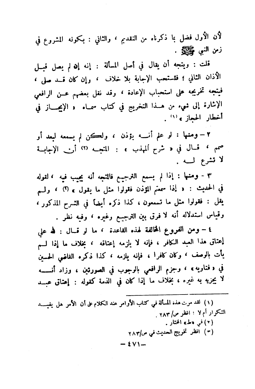 ٣ - وَمِنْهَا إِذا لم يسمع الترجيع فَالْمُتَّجه أَنه يُجيب فِيهِ لقَوْله فِي الحَدِيث إِذا سَمِعْتُمْ الْمُؤَذّن فَقولُوا مثل مَا يَقُول وَلم يقل فَقولُوا مثل مَا تَسْمَعُونَ كَذَا ذكره ايضا فِي الشَّرْح الْمَذْكُور وَقِيَاس استدلاله أَنه لَا فرق بَين الترجيع وَغَيره وَفِيه نظر