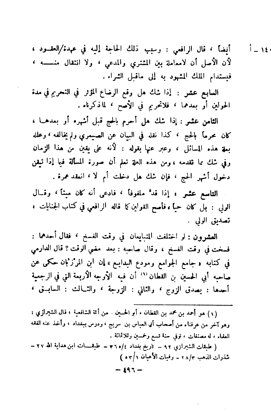 الْعشْرُونَ لَو اخْتلفت الْمُتَبَايعَانِ فِي وَقت الْفَسْخ فَقَالَ أَحدهمَا فسخت فِي وَقت الْفَسْخ وَقَالَ صَاحبه بعد مُضِيّ الْوَقْت قَالَ الدَّارمِيّ فِي كِتَابه جَامع الْجَوَامِع ومودع البدايع إِن ابْن الْمَرْزُبَان حكى عَن صَاحبه أبي الْحُسَيْن بن الْقطَّان أَن فِيهِ الْأَوْجه الْأَرْبَعَة الَّتِي فِي الرَّجْعِيَّة أَحدهَا يصدق الزَّوْج وَالثَّانِي الزَّوْجَة وَالثَّالِث السَّابِق