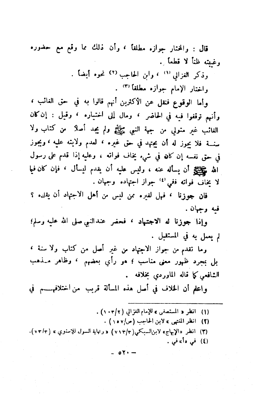 وَأما الْوُقُوع فَنقل عَن الْأَكْثَرين أَنهم قَالُوا بِهِ فِي حق الْغَائِب وَأَنَّهُمْ توقفوا فِي الْحَاضِر وَمَال إِلَى اخْتِيَاره وَقيل إِن كَانَ الْغَائِب غير مُتَوَلِّي من جِهَة النَّبِي صلى الله عَلَيْهِ وَسلم وَلم يجد أصلا من كتاب وَلَا سنة فَلَا يجوز لَهُ أَن يجْتَهد فِي حق غَيره لعدم ولَايَته عَلَيْهِ وَيجوز فِي حق نَفسه إِن كَانَ فِي شَيْء يخَاف فَوَاته وَعَلِيهِ إِذا قدم على رَسُول الله صلى الله عَلَيْهِ وَسلم أَن يسْأَله عَنهُ وَلَيْسَ عَلَيْهِ أَن يقدم ليسأل فَإِن كَانَ فِيمَا لَا يخَاف فَوَاته فَفِي جَوَاز اجْتِهَاده وَجْهَان فَإِن جَوَّزنَا فَهَل لغيره مِمَّن لَيْسَ من أهل الِاجْتِهَاد أَن يقلده فِيهِ وَجْهَان