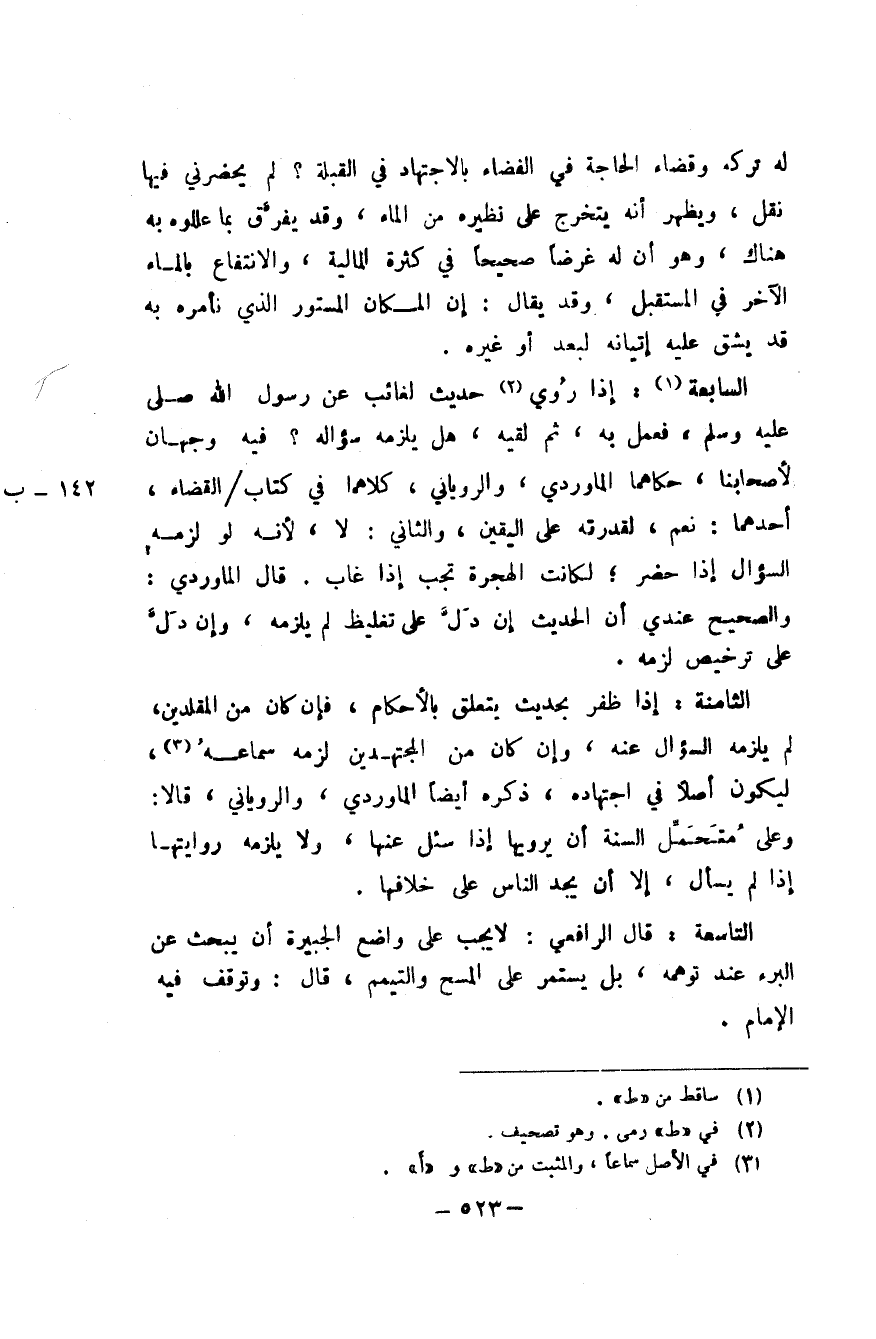السَّابِعَة إِذا رُوِيَ حَدِيث لغَائِب عَن رَسُول الله صلى الله عَلَيْهِ وَسلم فَعمل بِهِ ثمَّ لقِيه هَل يلْزمه سُؤَاله فِيهِ وَجْهَان لِأَصْحَابِنَا حَكَاهُمَا الْمَاوَرْدِيّ وَالرُّويَانِيّ كِلَاهُمَا فِي كتاب الْقَضَاء أَحدهمَا نعم لقدرته على الْيَقِين وَالثَّانِي لَا لِأَنَّهُ لَو لزمَه السُّؤَال إِذا حضر لكَانَتْ الْهِجْرَة تجب إِذا غَابَ قَالَ الْمَاوَرْدِيّ وَالصَّحِيح عِنْدِي أَن الحَدِيث إِن دلّ على تَغْلِيظ لم يلْزمه وَإِن دلّ على ترخيص لزمَه