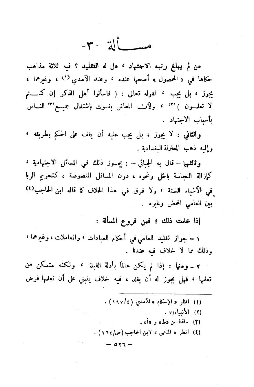من لم يبلغ رُتْبَة الِاجْتِهَاد هَل لَهُ التَّقْلِيد فِيهِ ثَلَاثَة مَذَاهِب حَكَاهَا فِي الْمَحْصُول أَصَحهَا عِنْده وَعند الْآمِدِيّ وَغَيرهمَا يجوز بل يجب لقَوْله تَعَالَى {فاسألوا أهل الذّكر إِن كُنْتُم لَا تعلمُونَ} وَلِأَن المعاش يفوت باشتغال جَمِيع النَّاس بِأَسْبَاب الِاجْتِهَاد