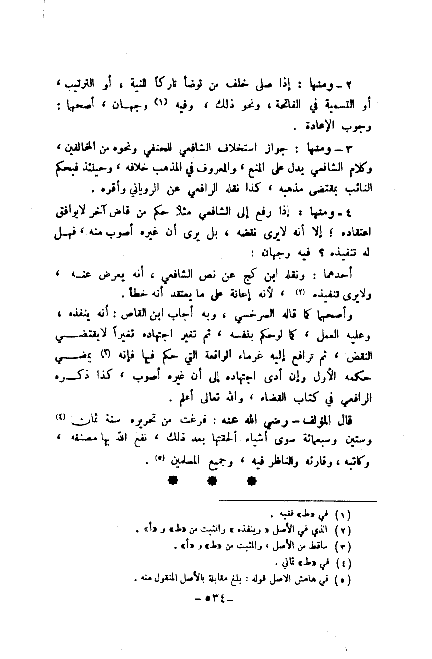 ٣ - وَمِنْهَا جَوَاز اسْتِخْلَاف الشَّافِعِي للحنفي وَنَحْوه من الْمُخَالفين وَكَلَام الشَّافِعِي يدل على الْمَنْع وَالْمَعْرُوف فِي الْمَذْهَب خِلَافه وَحِينَئِذٍ فَيحكم النَّائِب بِمُقْتَضى مذْهبه كَذَا نَقله الرَّافِعِيّ عَن الرَّوْيَانِيّ وَأقرهُ