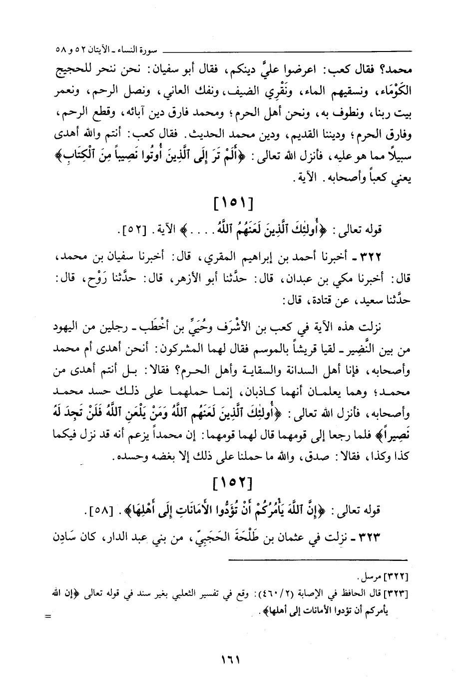 ( «323» - نَزَلَتْ فِي عُثْمَانَ بْنِ طَلْحَةَ الْحَجَبِيِّ، مِنْ بَنِي عَبْدِ الدَّارِ، كَانَ سَادِنَ