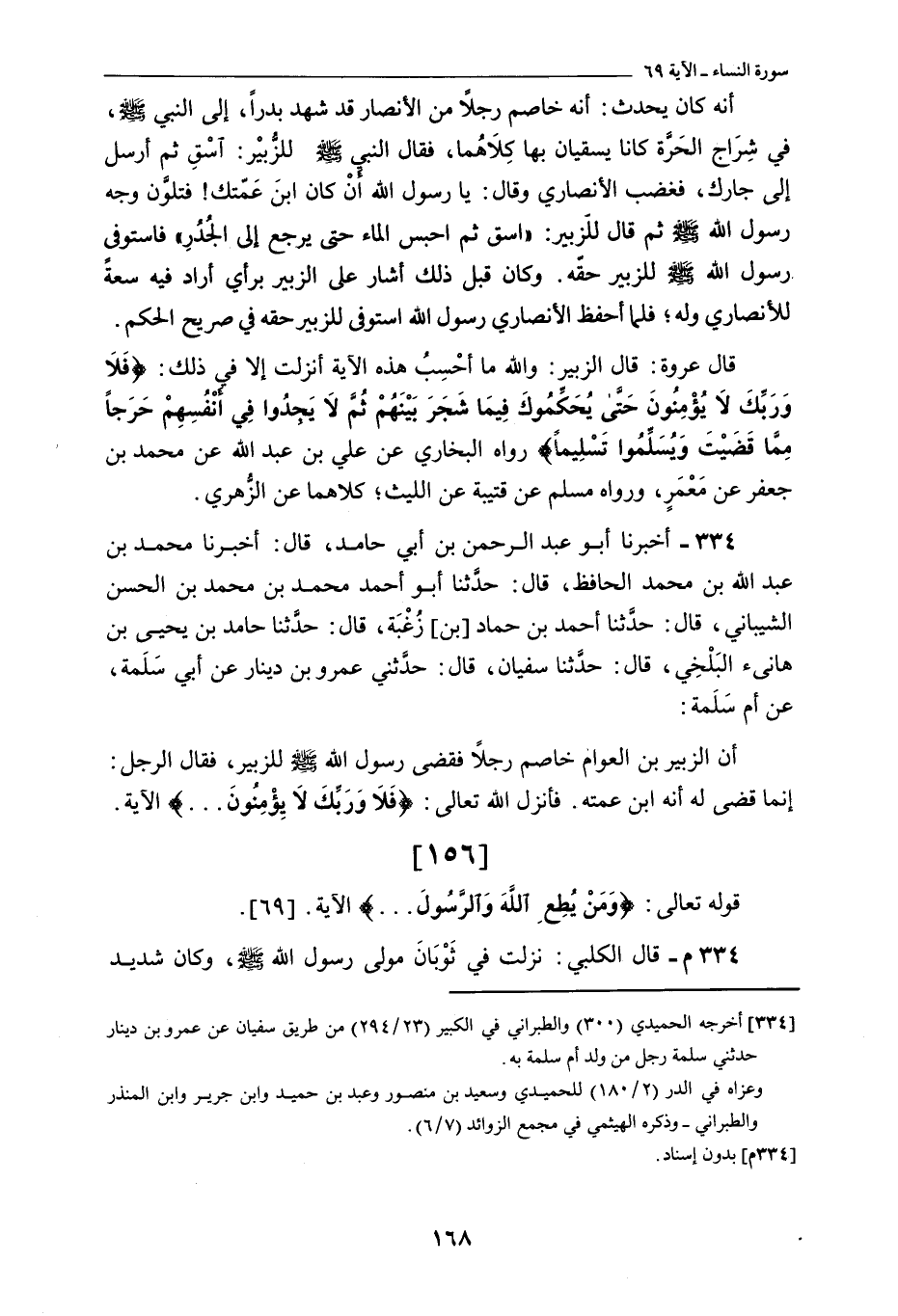 قَالَ عُرْوَةُ: قَالَ الزُّبَيْرُ: وَاللَّهِ مَا أَحْسَبُ هَذِهِ الْآيَةَ أُنْزِلَتْ إِلَّا فِي ذَلِكَ: فَلَا وَرَبِّكَ لَا يُؤْمِنُونَ حَتَّى يُحَكِّمُوكَ فِيمَا شَجَرَ بَيْنَهُمْ ثُمَّ لَا يَجِدُوا فِي أَنْفُسِهِمْ حَرَجًا مِمَّا قَضَيْتَ وَيُسَلِّمُوا تَسْلِيمًا رَوَاهُ الْبُخَارِيُّ عَنْ عَلِيِّ بْنِ عَبْدِ اللَّهِ عَنْ مُحَمَّدِ بْنِ جَعْفَرٍ عَنْ مَعْمَرٍ، وَرَوَاهُ مُسْلِمٌ عَنْ قُتَيْبَةَ عَنِ اللَّيْثِ، كِلَاهُمَا عَنِ الزُّهْرِيِّ.)