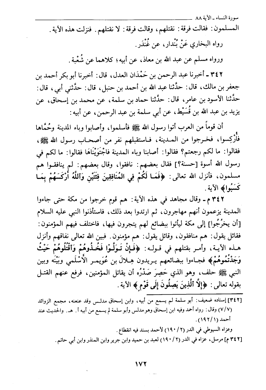 «3421» م- وَقَالَ مُجَاهِدٌ فِي هَذِهِ الْآيَةِ: هُمْ قَوْمٌ خَرَجُوا مِنْ مَكَّةَ حَتَّى جَاءُوا الْمَدِينَةَ يَزْعُمُونَ أَنَّهُمْ مُهَاجِرُونَ، ثُمَّ ارْتَدُّوا بَعْدَ ذَلِكَ، فَاسْتَأْذَنُوا النَّبِيَّ عَلَيْهِ السَّلَامُ [أَنْ يَخْرُجُوا] إِلَى مَكَّةَ لِيَأْتُوا بِبَضَائِعَ لَهُمْ يَتَّجِرُونَ فِيهَا، فَاخْتَلَفَ فِيهِمُ الْمُؤْمِنُونَ: