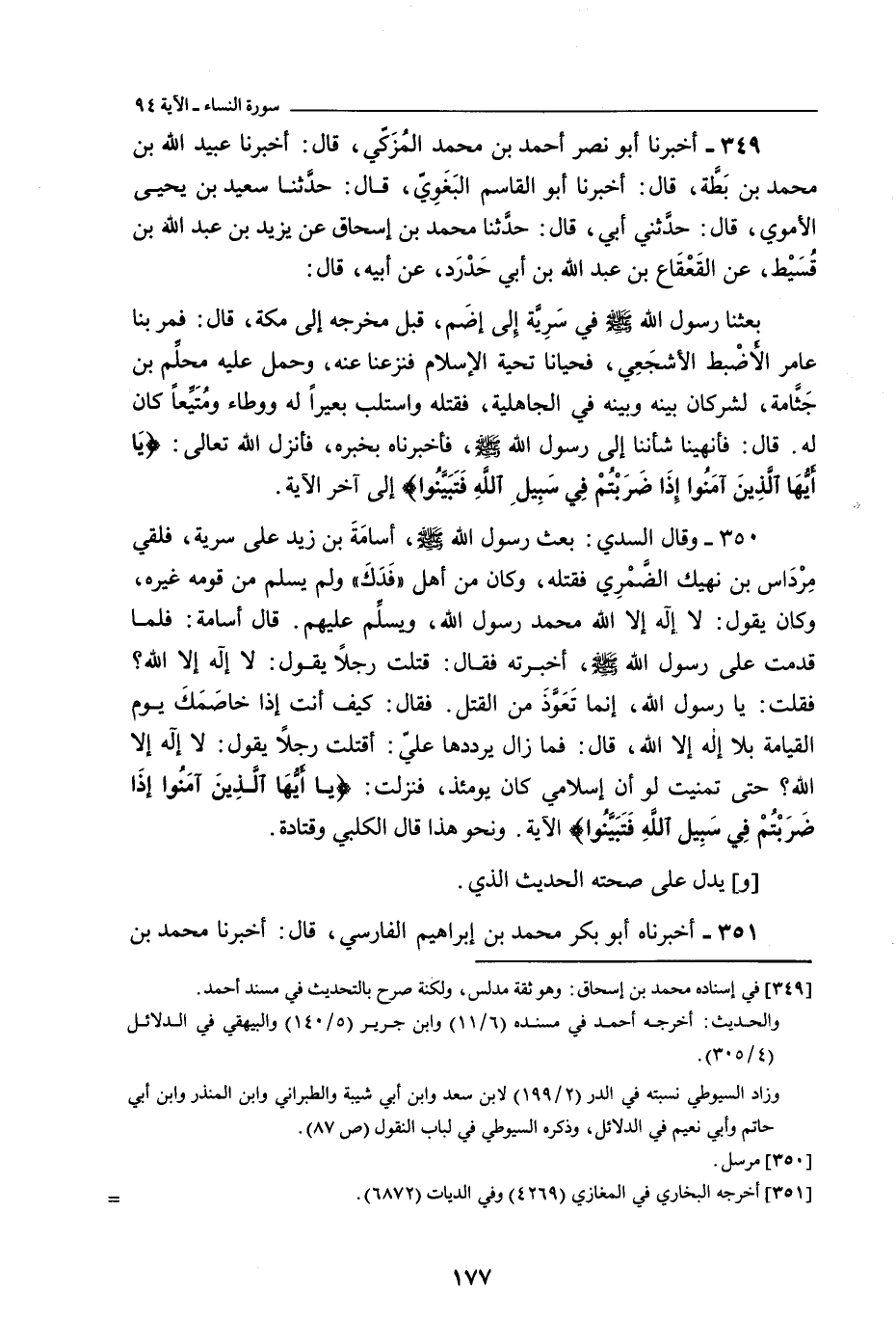 ( «350» - وَقَالَ السُّدِّيُّ: بَعَثَ رسول اللَّه صلى اللَّه عليه وسلم، أُسَامَةَ بْنَ زَيْدٍ عَلَى سَرِيَّةٍ، فَلَقِيَ مِرْدَاسَ بْنَ نَهِيكٍ الضَّمْرِيُّ فَقَتَلَهُ، وَكَانَ مِنْ أَهْلِ «فَدَكٍ» وَلَمْ يُسْلِمْ مِنْ قَوْمِهِ غَيْرُهُ، وَكَانَ يَقُولُ: لَا إِلَهَ إِلَّا اللَّهُ مُحَمَّدٌ رَسُولُ اللَّهِ، وَيُسَلِّمُ عَلَيْهِمْ. قَالَ أُسَامَةُ: فَلَمَّا قَدِمْتُ عَلَى رسول اللَّه صلى اللَّه عليه وسلم، أَخْبَرْتُهُ فَقَالَ: قَتَلْتَ رَجُلًا يَقُولُ: لَا إِلَهَ إِلَّا اللَّهُ؟
