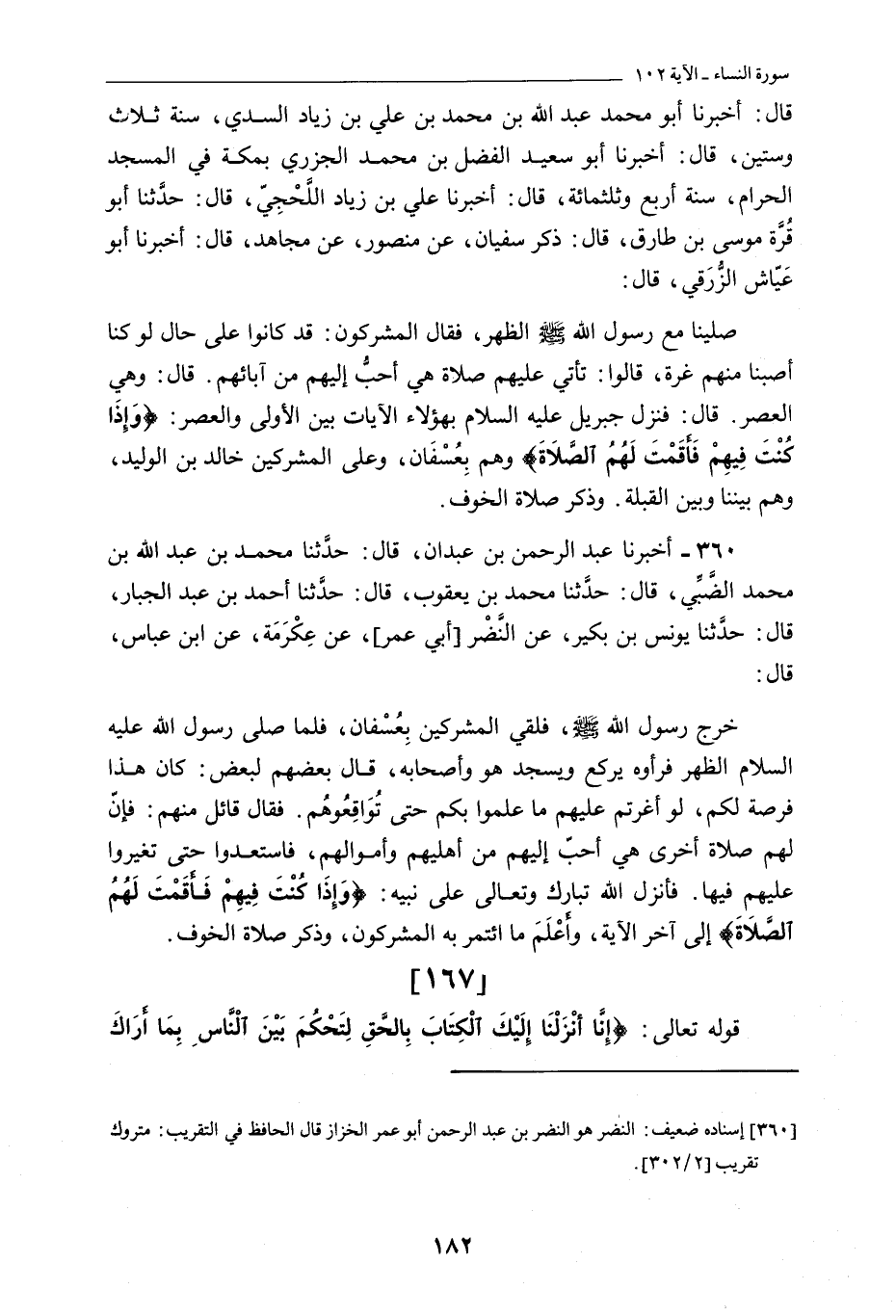 خَرَجَ رَسُولُ اللَّهِ صَلَّى اللَّه عليه وسلم، فلقي المشركين بِعُسْفان، فلما صلى رَسُولُ اللَّهِ عَلَيْهِ السَّلَامُ الظُّهْرَ فَرَأَوْهُ يَرْكَعُ وَيَسْجُدُ هُوَ وَأَصْحَابُهُ، قَالَ بَعْضُهُمْ لِبَعْضٍ: كَانَ هَذَا فُرْصَةً لَكُمْ، لَوْ أَغَرْتُمْ عَلَيْهِمْ مَا عَلِمُوا بِكُمْ حَتَّى تُوَاقِعُوهُمْ. فَقَالَ قَائِلٌ مِنْهُمْ: فَإِنَّ لَهُمْ صَلَاةً أُخْرَى هِيَ أَحَبُّ إِلَيْهِمْ مِنْ أَهْلِيهِمْ وَأَمْوَالِهِمْ، فَاسْتَعِدُّوا حَتَّى تُغِيرُوا عَلَيْهِمْ فِيهَا. فَأَنْزَلَ اللَّهُ تَبَارَكَ وَتَعَالَى عَلَى نَبِيِّهِ: وَإِذَا كُنْتَ فِيهِمْ فَأَقَمْتَ لَهُمُ الصَّلَاةَ إِلَى آخِرِ الْآيَةِ، وَأَعْلَمَ مَا ائْتَمَرَ بِهِ الْمُشْرِكُونَ، وَذَكَرَ صَلَاةَ الْخَوْفِ.