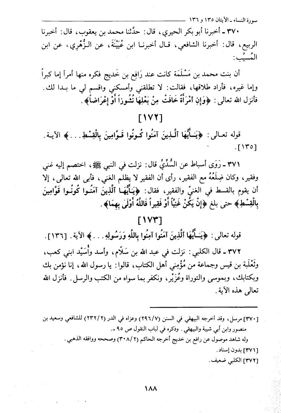 ( «371» - رَوَى أَسْبَاطٌ عَنِ السُّدِّيِّ قَالَ: نَزَلَتْ في النبي صلى اللَّه عليه وسلم، اخْتَصَمَ إِلَيْهِ غَنِيٌّ وَفَقِيرٌ، وَكَانَ ضِلْعُهُ مَعَ الْفَقِيرِ، رَأَى أَنَّ الْفَقِيرَ لَا يَظْلِمُ الْغَنِيَّ، فَأَبَى اللَّهُ تَعَالَى، إِلَّا أَنْ يَقُومَ بِالْقِسْطِ فِي الْغَنِيِّ والفقير، فقال: يا أَيُّهَا الَّذِينَ آمَنُوا كُونُوا قَوَّامِينَ بِالْقِسْطِ حَتَّى بَلَغَ إِنْ يَكُنْ غَنِيًّا أَوْ فَقِيرًا فَاللَّهُ أَوْلى بِهِما.)