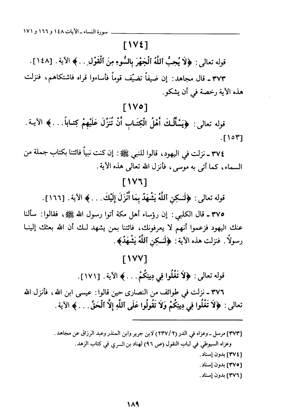 «376» - نَزَلَتْ فِي طَوَائِفَ مِنَ النَّصَارَى حِينَ قَالُوا: عِيسَى ابْنُ اللَّهِ، فَأَنْزَلَ اللَّهُ تَعَالَى: لَا تَغْلُوا فِي دِينِكُمْ وَلَا تَقُولُوا عَلَى اللَّهِ إِلَّا الْحَقَّ ... الْآيَةَ.