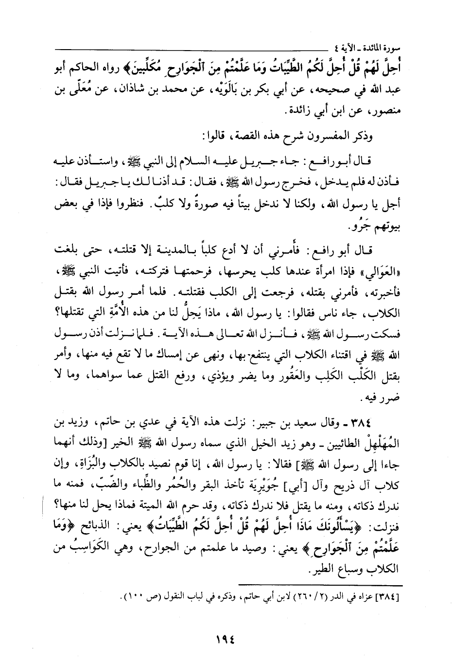 «384» - وَقَالَ سَعِيدُ بْنُ جُبَيْرٍ: نَزَلَتْ هَذِهِ الْآيَةُ فِي عَدِيِّ بْنِ حَاتِمٍ، وَزَيْدِ بْنِ الْمُهَلْهِلِ الطَّائِيَّيْنِ- وَهُوَ زَيْدُ الْخَيْلِ الَّذِي سَمَّاهُ رسول اللَّه صلى اللَّه عليه وسلم الْخَيْرَ [وَذَلِكَ أَنَّهُمَا جَاءَا إِلَى رسول اللَّه صلى اللَّه عليه وسلم] فَقَالَا: يَا رَسُولَ اللَّهِ، إِنَّا قَوْمٌ نَصِيدُ بِالْكِلَابِ وَالْبُزَاةِ، وَإِنَّ كِلَابَ آلِ ذُرَيْحٍ وَآلِ [أَبِي] جُوَيْرِيَةَ تَأْخُذُ الْبَقَرَ وَالْحُمُرَ وَالظِّبَاءَ وَالضَّبَّ، فَمِنْهُ مَا نُدْرِكُ ذَكَاتَهُ، وَمِنْهُ مَا يُقْتَلُ فَلَا نُدْرِكُ ذَكَاتَهُ، وَقَدْ حَرَّمَ اللَّهُ الْمَيْتَةَ فَمَاذَا يَحِلُّ لَنَا منها؟