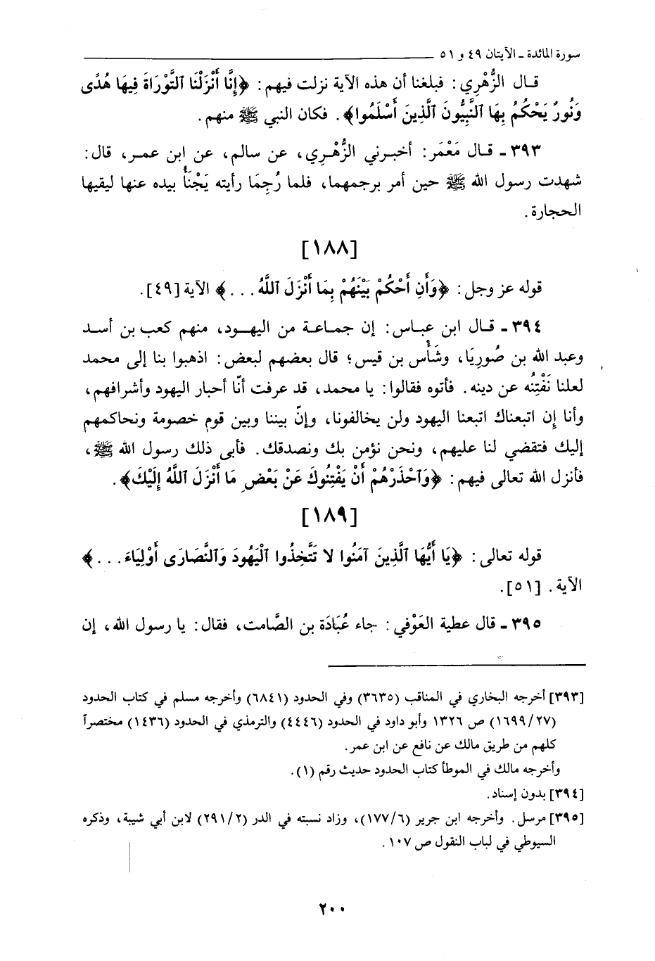 ( «394» - قَالَ ابْنُ عَبَّاسٍ: إِنَّ جَمَاعَةً مِنَ الْيَهُودِ، مِنْهُمْ كَعْبُ بْنُ أَسَدٍ وَعَبْدُ اللَّهِ بْنُ صُورِيَا، وَشَاسُ بْنُ قَيْسٍ، قَالَ بَعْضُهُمْ لِبَعْضٍ: اذْهَبُوا بِنَا إِلَى مُحَمَّدٍ لَعَلَّنَا نَفْتِنُهُ عَنْ دِينِهِ. فَأَتَوْهُ فَقَالُوا: يَا مُحَمَّدُ، قَدْ عَرَفْتَ أَنَّا أَحْبَارُ الْيَهُودِ وَأَشْرَافُهُمْ، وَأَنَّا إِنِ اتَّبَعْنَاكَ اتَّبَعَنَا الْيَهُودُ وَلَنْ يُخَالِفُونَا، وَإِنَّ بَيْنَنَا وَبَيْنَ قَوْمٍ خُصُومَةً وَنُحَاكِمُهُمْ إِلَيْكَ فَتَقْضِي لَنَا عَلَيْهِمْ، وَنَحْنُ نُؤْمِنُ بِكَ وَنُصَدِّقُكَ. فَأَبَى ذَلِكَ رسول اللَّه صلى اللَّه عليه وسلم، فَأَنْزَلَ اللَّهُ تَعَالَى فِيهِمْ: وَاحْذَرْهُمْ أَنْ يَفْتِنُوكَ عَنْ بَعْضِ مَا أَنْزَلَ اللَّهُ إِلَيْكَ.)