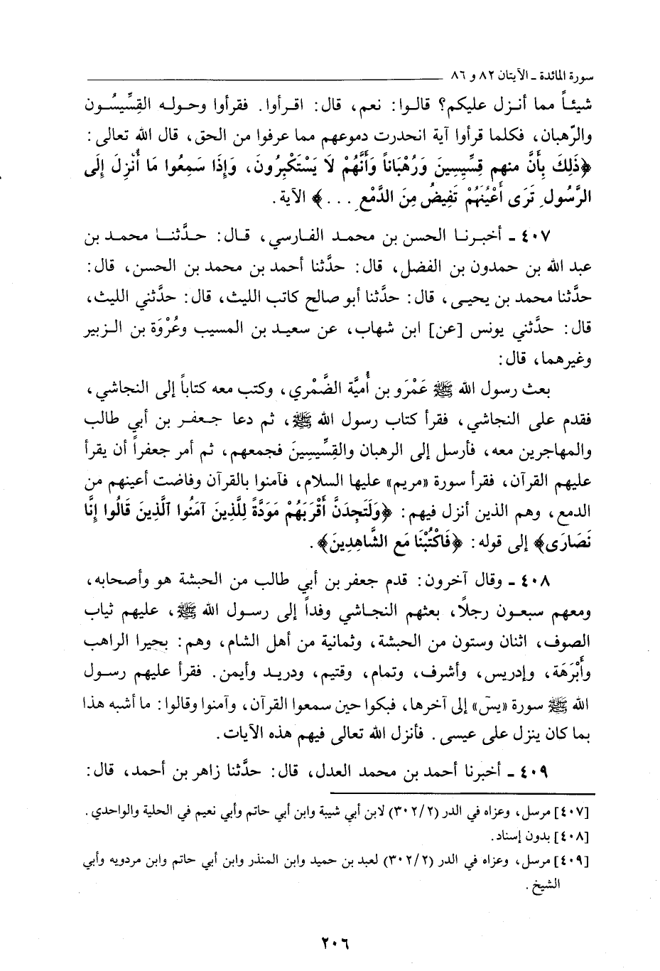 ( «408» - وَقَالَ آخَرُونَ: قَدِمَ جَعْفَرُ بْنُ أَبِي طَالِبٍ مِنَ الْحَبَشَةِ هُوَ وَأَصْحَابُهُ، وَمَعَهُمْ سَبْعُونَ رَجُلًا، بَعَثَهُمُ النَّجَاشِيُّ وَفْدًا إِلَى رسول اللَّه صلى اللَّه عليه وسلم، عَلَيْهِمْ ثِيَابُ الصُّوفِ، اثْنَانِ وَسِتُّونَ مِنَ الْحَبَشَةِ، وَثَمَانِيَةٌ مِنْ أَهْلِ الشَّامِ، وَهُمْ: بَحِيرَا الرَّاهِبُ وَأَبْرَهَةُ، وَإِدْرِيسُ، وأشرف، وتمام، وقيتم، وَدُرَيْدٌ وَأَيْمَنُ. فَقَرَأَ عَلَيْهِمْ رسول اللَّه صلى اللَّه عليه وسلم سُورَةَ «يس» إِلَى آخِرِهَا، فَبَكَوْا حِينَ سَمِعُوا الْقُرْآنَ، وَآمَنُوا وَقَالُوا: مَا أَشْبَهَ هَذَا بِمَا كَانَ يَنْزِلُ عَلَى عِيسَى. فَأَنْزَلَ اللَّهُ تَعَالَى فِيهِمْ هَذِهِ الْآيَاتِ) .