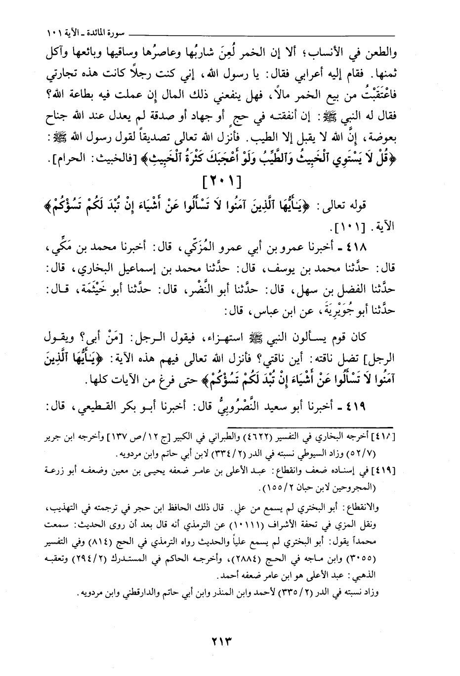 [201] قوله تعالى: يا أَيُّهَا الَّذِينَ آمَنُوا لا تَسْئَلُوا عَنْ أَشْيَاءَ إِنْ تُبْدَ لَكُمْ تَسُؤْكُمْ الْآيَةَ. [101] .