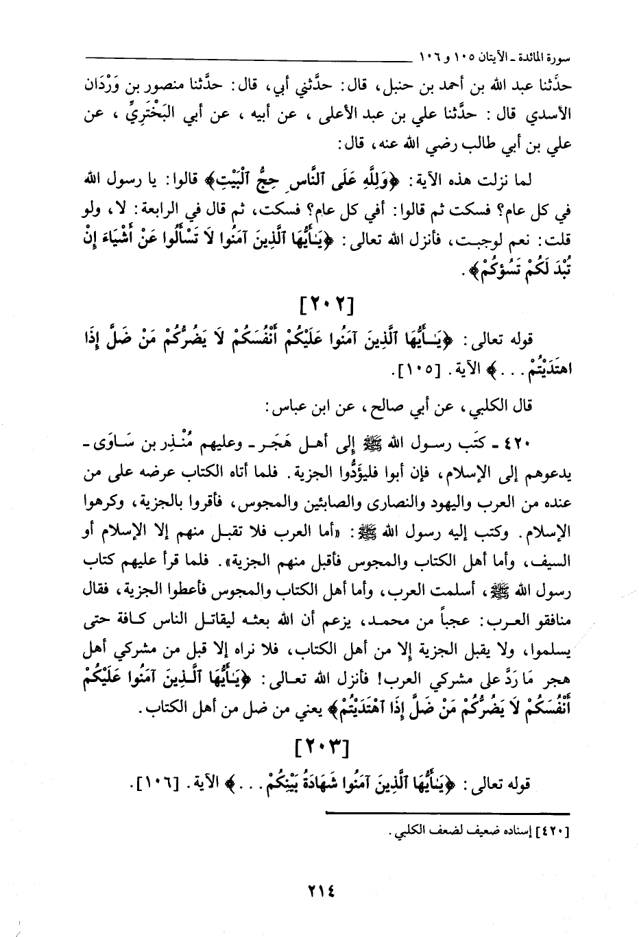 [202] قوله تعالى: يا أَيُّهَا الَّذِينَ آمَنُوا عَلَيْكُمْ أَنْفُسَكُمْ لَا يَضُرُّكُمْ مَنْ ضَلَّ إِذَا اهْتَدَيْتُمْ ... الْآيَةَ. [105] .