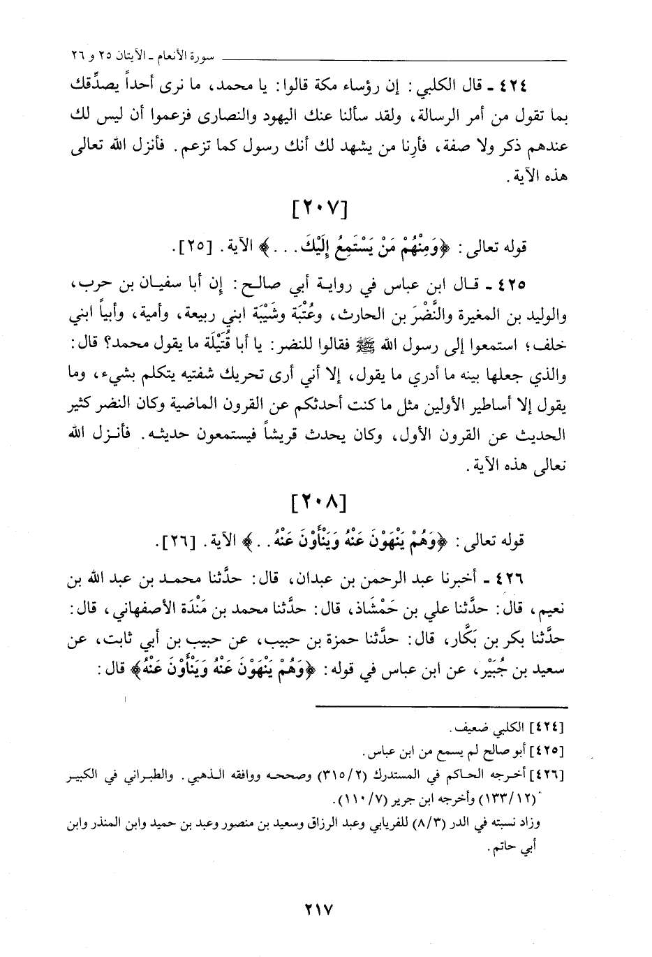 «425» - قَالَ ابْنُ عَبَّاسٍ فِي رِوَايَةِ أَبِي صَالِحٍ: إِنَّ أَبَا سُفْيَانَ بْنَ حَرْبٍ، وَالْوَلِيدَ بْنَ الْمُغِيرَةِ وَالنَّضْرَ بْنَ الْحَارِثِ، وَعُتْبَةَ وَشَيْبَةَ ابْنَيْ رَبِيعَةَ، وَأُمَيَّةَ، وَأُبَيًّا ابْنَيْ خَلَفٍ، اسْتَمَعُوا إِلَى رسول اللَّه صلى اللَّه عليه وسلم فَقَالُوا لِلنَّضْرِ: يَا أَبَا قُتَيْلَةَ مَا يَقُولُ مُحَمَّدٌ؟ قَالَ: