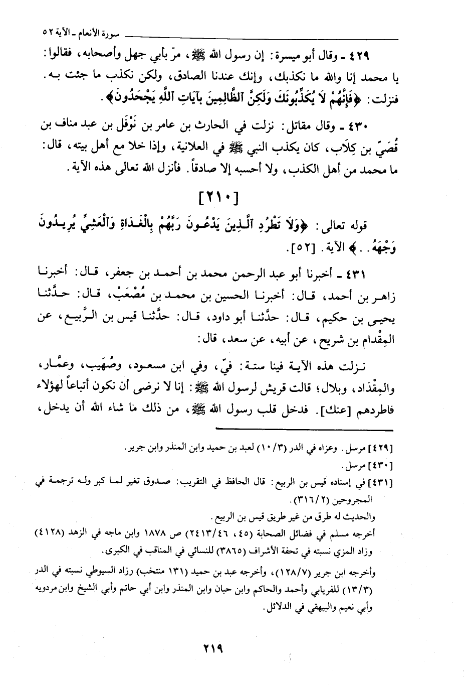 [210] قَوْلُهُ تَعَالَى: وَلَا تَطْرُدِ الَّذِينَ يَدْعُونَ رَبَّهُمْ بِالْغَدَاةِ وَالْعَشِيِّ يُرِيدُونَ وَجْهَهُ.. الْآيَةَ. [52] .