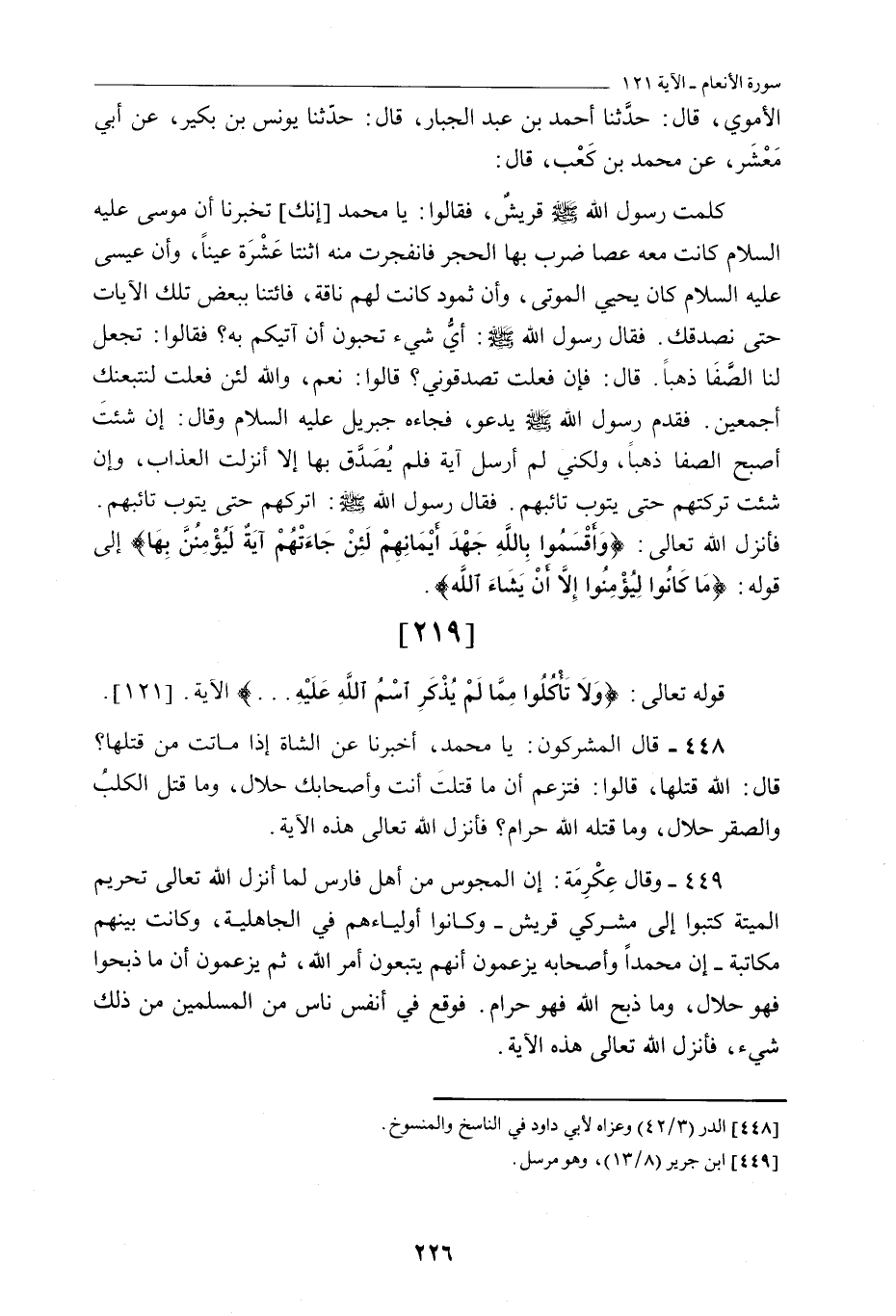 [219] قَوْلُهُ تَعَالَى: وَلَا تَأْكُلُوا مِمَّا لَمْ يُذْكَرِ اسْمُ اللَّهِ عَلَيْهِ ... الْآيَةَ. [121] .