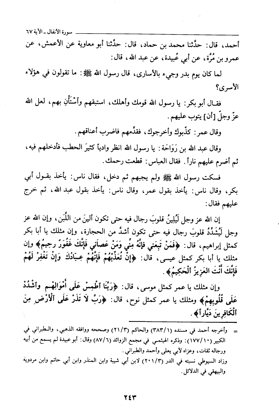لَمَّا كَانَ يَوْمُ بدر وجيء بالأسارى، قَالَ رسول اللَّه صلى اللَّه عليه وسلم: مَا تَقُولُونَ فِي هَؤُلَاءِ الْأَسْرَى؟