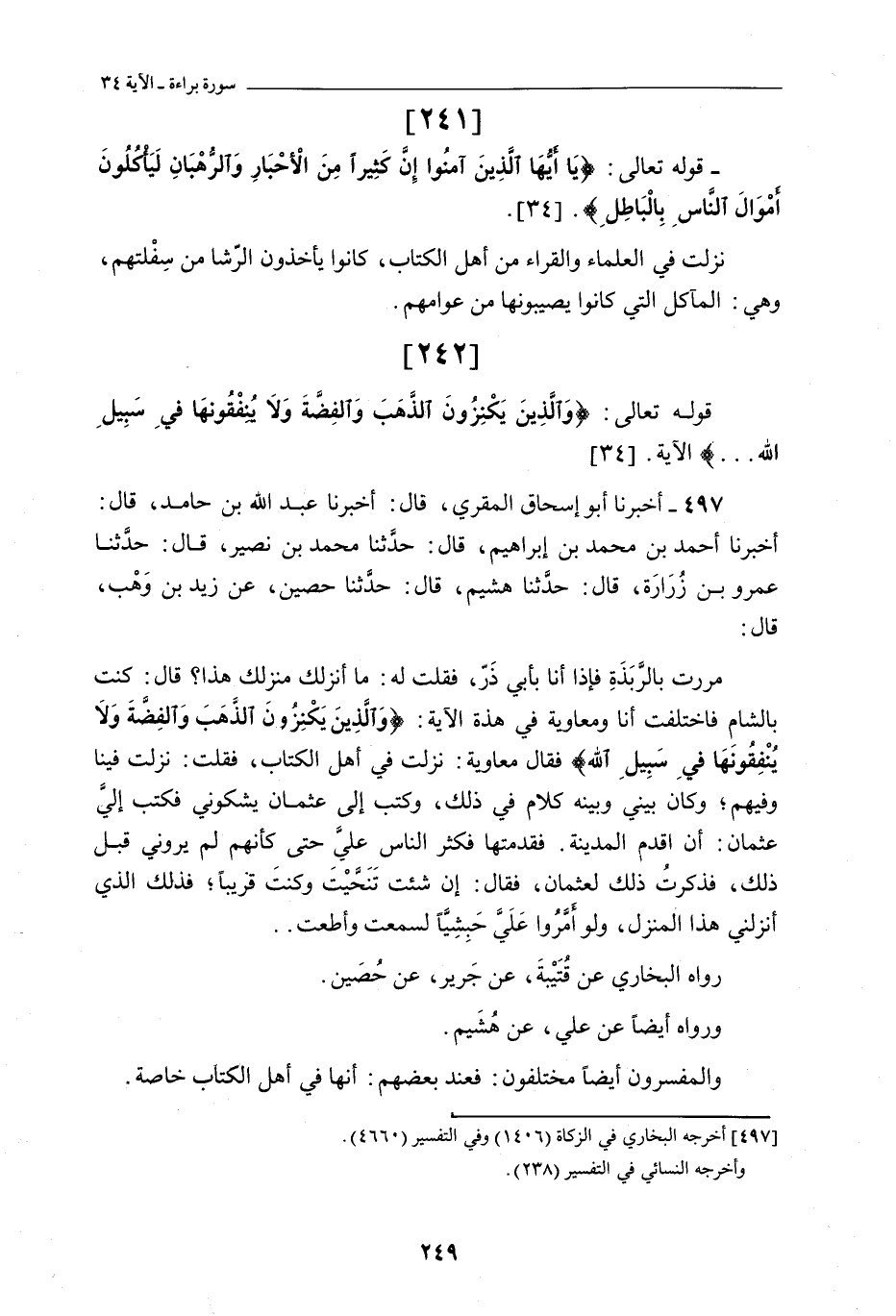 [242] قَوْلُهُ تَعَالَى: وَالَّذِينَ يَكْنِزُونَ الذَّهَبَ وَالْفِضَّةَ وَلَا يُنْفِقُونَهَا فِي سَبِيلِ اللَّهِ ... الْآيَةَ. [34]