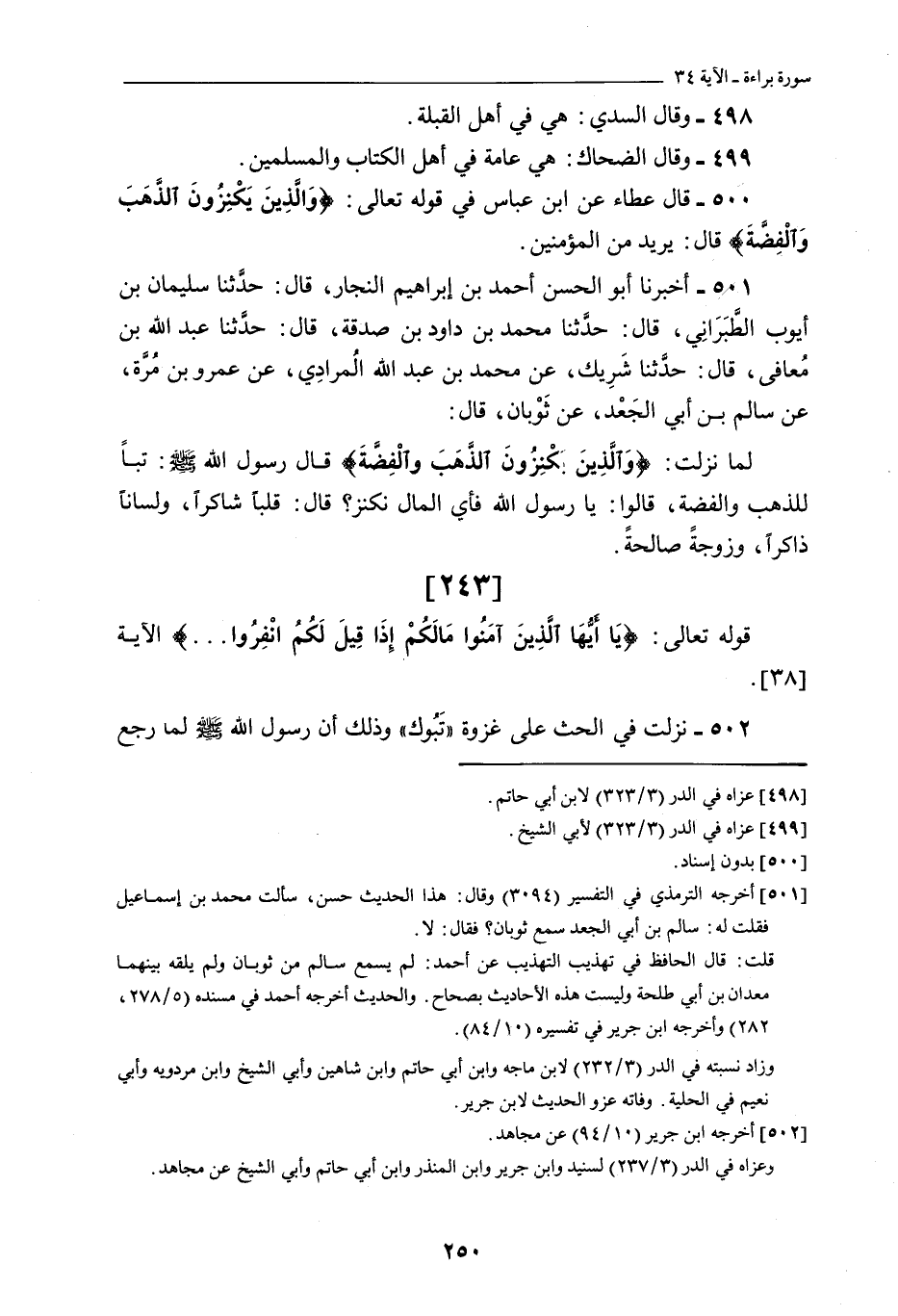 9/ 34 ( «500» - قال عَطَاءٌ عَنِ ابْنِ عَبَّاسٍ فِي قَوْلِهِ تَعَالَى: وَالَّذِينَ يَكْنِزُونَ الذَّهَبَ وَالْفِضَّةَ قَالَ: يُرِيدُ مِنَ الْمُؤْمِنِينَ) .