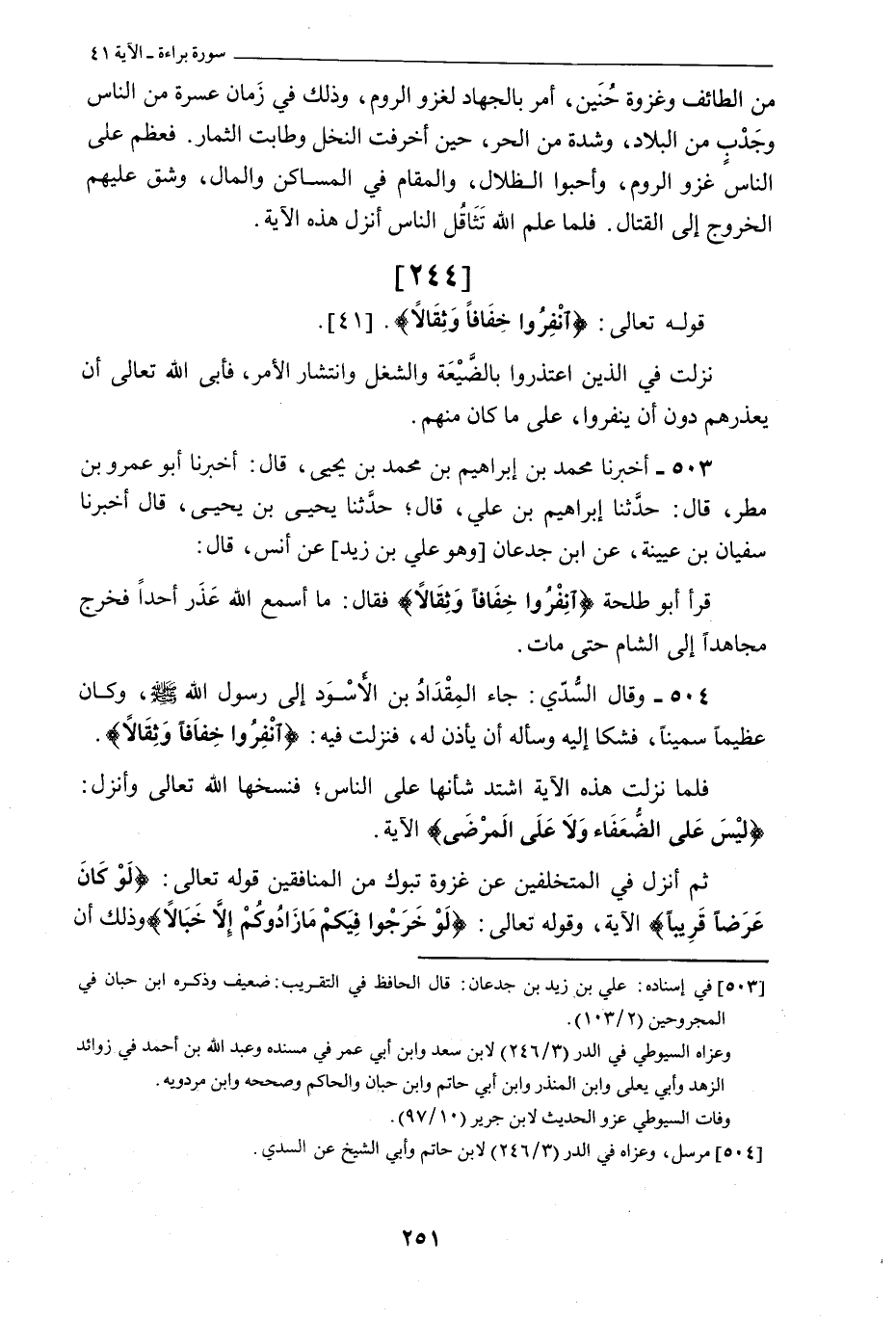 9/ 41 ( «504» - وَقَالَ السُّدِّيُّ: جَاءَ الْمِقْدَادُ بْنُ الْأَسْوَدِ إِلَى رسول اللَّه صلى اللَّه عليه وسلم، وَكَانَ عَظِيمًا سَمِينًا، فَشَكَا إِلَيْهِ وَسَأَلَهُ أَنْ يَأْذَنَ لَهُ، فَنَزَلَتْ فِيهِ: انْفِرُوا خِفَافًا وَثِقَالًا.