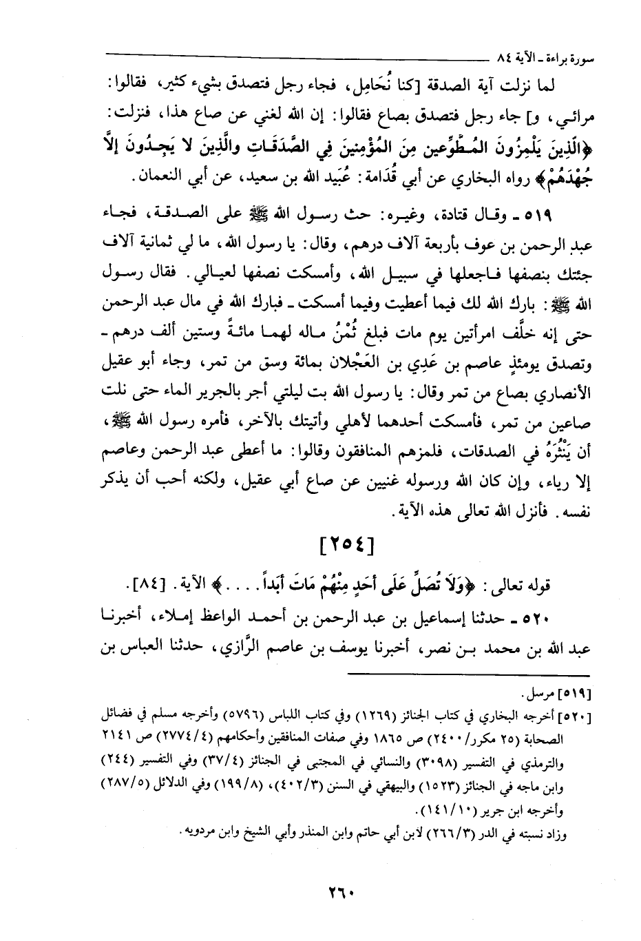 (520) أخرجه البخاري في كتاب الجنائز (1269) وفي كتاب اللباس (5796) وأخرجه مسلم في فضائل الصحابة (25 مكرر/ 2400) ص 1865 وفي صفات المنافقين وأحكامهم (4/ 2774) ص 2141 والترمذي في التفسير (3098) والنسائي في المجتبى في الجنائز (4/ 37) وفي التفسير (244) وابن ماجة في الجنائز (1523) والبيهقي في السنن (3/ 402) ، (8/ 199) وفي الدلائل (5/ 287) وأخرجه ابن جرير (10/ 141) .