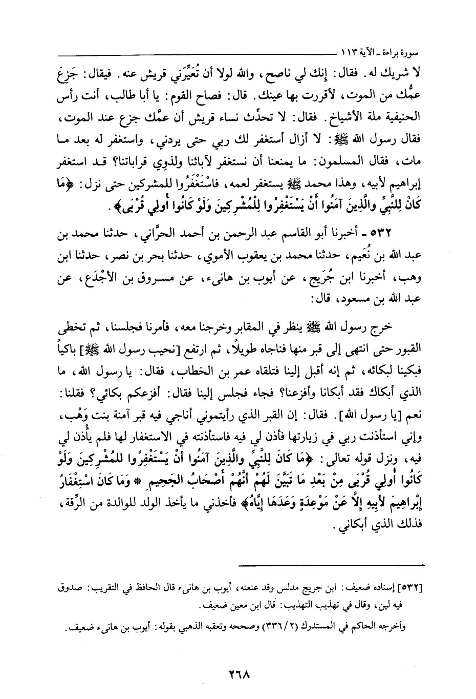 «532» - أَخْبَرَنَا أَبُو الْقَاسِمِ عَبْدِ الرَّحْمَنِ بْنِ أَحْمَدَ الْحَرَّانِيُّ، حَدَّثَنَا مُحَمَّدُ بْنُ عَبْدِ اللَّهِ بْنِ نُعَيْمٍ، حَدَّثَنَا مُحَمَّدُ بْنُ يَعْقُوبَ الْأُمَوِيُّ، حَدَّثَنَا بَحْرُ بْنُ نَصْرٍ، حَدَّثَنَا ابْنُ وَهْبٍ، أَخْبَرَنَا ابْنُ جُرَيْجٍ، عَنْ أَيُّوبَ بْنِ هَانِئٍ، عَنْ مَسْرُوقِ بْنِ الْأَجْدَعِ، عَنْ عَبْدِ اللَّهِ بْنِ مَسْعُودٍ، قَالَ:
