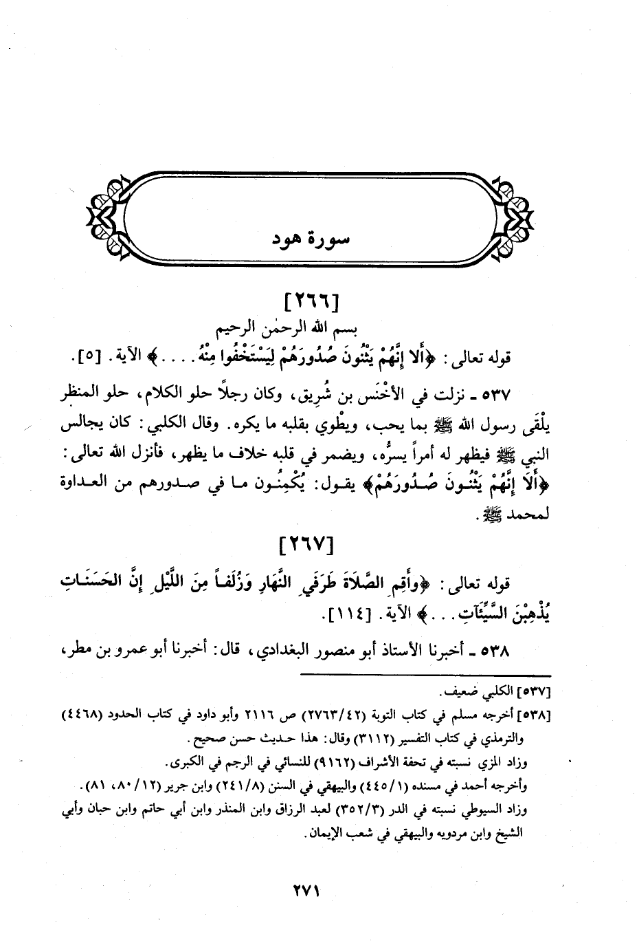 [267] قَوْلُهُ تَعَالَى: وَأَقِمِ الصَّلَاةَ طَرَفَيِ النَّهَارِ وَزُلَفًا مِنَ اللَّيْلِ إِنَّ الْحَسَنَاتِ يُذْهِبْنَ السَّيِّئَاتِ ... الْآيَةَ. [114] .