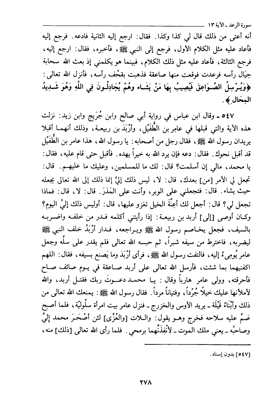 «547» - وَقَالَ ابْنُ عَبَّاسٍ فِي رِوَايَةِ أَبِي صَالِحٍ وَابْنِ جُرَيْجٍ وَابْنِ زَيْدٍ: نَزَلَتْ هَذِهِ الْآيَةُ وَالَّتِي قَبْلَهَا فِي عَامِرِ بْنِ الطُّفَيْلِ، وَأَرْبَدَ بْنِ رَبِيعَةَ، وَذَلِكَ أَنَّهُمَا أَقْبَلَا يُرِيدَانِ رسول اللَّه صلى اللَّه عليه وسلم، فَقَالَ رَجُلٌ مِنْ أَصْحَابِهِ: يَا رَسُولَ اللَّهِ، هَذَا عَامِرُ بْنُ الطُّفَيْلِ قَدْ أَقْبَلَ نَحْوَكَ. فَقَالَ: دَعْهُ فَإِنْ يُرِدِ اللَّهُ بِهِ خَيْرًا يَهْدِهِ. فَأَقْبَلَ حَتَّى قَامَ عَلَيْهِ، فَقَالَ: