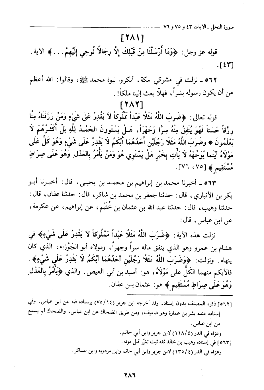 «562» - نَزَلَتْ فِي مُشْرِكِي مَكَّةَ، أَنْكَرُوا نبوة محمد صلى اللَّه عليه وسلم، وَقَالُوا: اللَّهُ أَعْظَمُ مِنْ أَنْ يَكُونَ رَسُولُهُ بَشَرًا، فَهَلَّا بَعَثَ إِلَيْنَا مَلَكًا!. ¬2) - قَوْلُهُ تَعَالَى: {ضَرَبَ اللَّهُ مَثَلًا عَبْدًا مَمْلُوكًا} الْآيَةَ {75} .