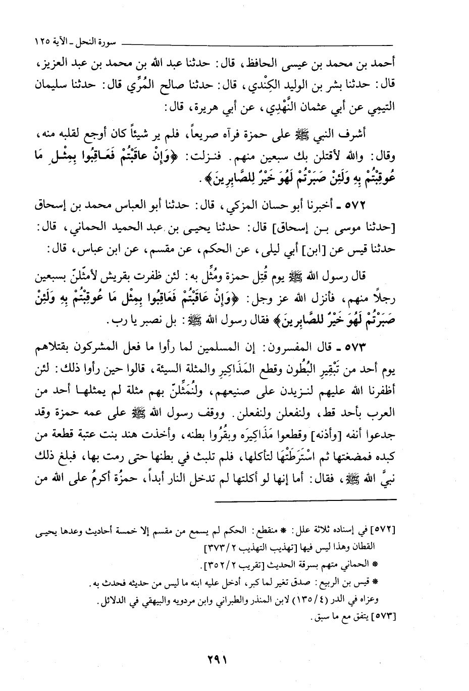«573» - قَالَ الْمُفَسِّرُونَ: إِنَّ الْمُسْلِمِينَ لَمَّا رَأَوْا مَا فَعَلَ الْمُشْرِكُونَ بِقَتْلَاهُمْ يَوْمَ أُحُدٍ مِنْ تَبْقِيرِ الْبُطُونِ وَقَطْعِ الْمَذَاكِيرِ وَالْمُثْلَةِ السَّيِّئَةِ، قَالُوا حِينَ رَأَوْا ذَلِكَ: لَئِنْ أَظْفَرَنَا اللَّهُ عَلَيْهِمْ لَنَزِيدَنَّ عَلَى صَنِيعِهِمْ، وَلَنُمَثِّلَنَّ بِهِمْ مُثْلَةً لَمْ يُمَثِّلْهَا أَحَدٌ مِنَ الْعَرَبِ بِأَحَدٍ قَطُّ، وَلَنَفْعَلَنَّ وَلَنَفْعَلَنَّ. وَوَقَفَ رسول اللَّه صلى اللَّه عليه وسلم عَلَى عَمِّهِ حَمْزَةَ وَقَدْ جَدَعُوا أَنْفَهُ [وَأُذُنَهُ] وَقَطَعُوا مَذَاكِيرَهُ وَبَقَرُوا بَطْنَهُ، وَأَخَذَتْ هِنْدُ بِنْتُ عُتْبَةَ قِطْعَةً مِنْ كَبِدِهِ فَمَضَغَتْهَا ثُمَّ اسْتَرَطَتْهَا لِتَأْكُلَهَا، فَلَمْ تَلْبَثْ فِي بَطْنِهَا حَتَّى رَمَتْ بِهَا، فَبَلَغَ ذَلِكَ نبيَّ اللَّه صلى اللَّه عليه وسلم، فَقَالَ: أَمَا إِنَّهَا لَوْ أَكَلَتْهَا لَمْ تَدْخُلِ النَّارَ أَبَدًا، حَمْزَةُ أَكْرَمُ عَلَى اللَّهِ مِنْ
