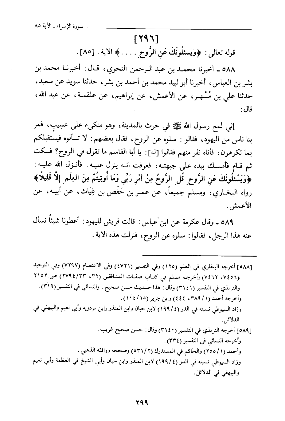 «589» - وَقَالَ عِكْرِمَةُ عَنِ ابْنِ عَبَّاسٍ: قَالَتْ قُرَيْشٌ لِلْيَهُودِ: اعْطُونَا شَيْئًا نَسْأَلُ عَنْهُ هَذَا الرَّجُلَ، فَقَالُوا: سَلُوهُ عَنِ الرُّوحِ، فَنَزَلَتْ هَذِهِ الْآيَةُ.