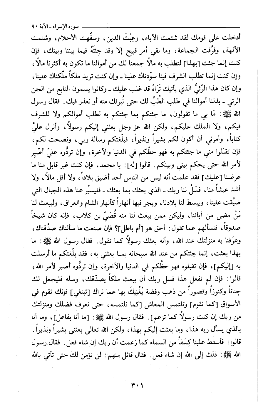 أَدْخَلْتَ عَلَى قَوْمِكَ لَقَدْ شَتَمْتَ الْآبَاءَ، وَعِبْتَ الدِّينَ، وَسَفَّهْتَ الْأَحْلَامَ، وَشَتَمْتَ الْآلِهَةَ، وَفَرَّقْتَ الْجَمَاعَةَ، وَمَا بَقِيَ أَمْرٌ قَبِيحٌ إِلَّا وَقَدْ جِئْتَهُ فِيمَا بَيْنَنَا وَبَيْنَكَ، فَإِنْ كُنْتَ إِنَّمَا جِئْتَ [بِهَذَا] لِتَطْلُبَ بِهِ مَالًا جَمَعْنَا لَكَ مِنْ أَمْوَالِنَا مَا تَكُونُ بِهِ أَكْثَرَنَا مَالًا، وَإِنْ كُنْتَ إِنَّمَا تَطْلُبُ الشَّرَفَ فِينَا سَوَّدْنَاكَ عَلَيْنَا- وَإِنْ كُنْتَ تُرِيدُ مُلْكًا مَلَّكْنَاكَ عَلَيْنَا، وَإِنْ كَانَ هَذَا الرِّئْيُّ الَّذِي يَأْتِيكَ تَرَاهُ قَدْ غَلَبَ عَلَيْكَ- وَكَانُوا يُسَمُّونَ التَّابِعَ مِنَ الْجِنِّ الرِّئْيَّ- بَذَلْنَا أَمْوَالَنَا فِي طَلَبِ الطِّبِّ لَكَ حَتَّى نُبْرِئَكَ مِنْهُ أَوْ نُعْذَرَ فِيكَ. فَقَالَ رسول اللَّه صلى اللَّه عليه وسلم: مَا بِي مَا تَقُولُونَ، مَا جِئْتُكُمْ بِمَا جِئْتُكُمْ بِهِ لِطَلَبِ أَمْوَالِكُمْ وَلَا لِلشَّرَفِ فِيكُمْ، وَلَا الْمُلْكِ عَلَيْكُمْ، وَلَكِنَّ اللَّهَ عَزَّ وَجَلَّ بَعَثَنِي إِلَيْكُمْ رَسُولًا، وَأَنْزَلَ عَلَيَّ كِتَابًا، وَأَمَرَنِي أَنْ أَكُونَ لَكُمْ بَشِيرًا وَنَذِيرًا، فَبَلَّغْتُكُمْ رِسَالَةَ رَبِّي، وَنَصَحْتُ لَكُمْ، فَإِنْ تَقْبَلُوا مِنِّي مَا جِئْتُكُمْ بِهِ فَهُوَ حَظُّكُمْ فِي الدُّنْيَا وَالْآخِرَةِ، وَإِنْ تَرُدُّوهُ عَلَيَّ أَصْبِرْ لِأَمْرِ اللَّهِ حَتَّى يَحْكُمَ بَيْنِي وَبَيْنَكُمْ. قَالُوا [لَهُ] : يا محمد، فإن كُنْتَ غَيْرَ قَابِلٍ مِنَّا مَا عرضنا [عليك] فقد عَلِمْتَ أنه ليس من الناس أَحَدٌ أَضْيَقَ بِلَادًا، وَلَا أَقَلَّ مَالًا، وَلَا أَشَدَّ عيشاً منا، فسَلْ لَنَا رَبَّكَ. الَّذِي بَعَثَكَ بِمَا بَعَثَكَ- فَلْيُسَيِّرْ عَنَّا هَذِهِ الْجِبَالَ الَّتِي ضُيِّقَتْ عَلَيْنَا، وَيَبْسُطْ لَنَا بِلَادَنَا، وَيُجْرِ فِيهَا أَنْهَارًا كَأَنْهَارِ الشام والعراق، وليبعث لَنَا مَنْ مَضَى مِنْ آبَائِنَا، وَلْيَكُنْ مِمَّنْ يبعث لنا منه قُصَيُّ بْنُ كِلَابٍ، فَإِنَّهُ كَانَ شَيْخًا صَدُوقًا، فَنَسْأَلُهُمْ عَمَّا تَقُولُ: أَحَقٌّ هُوَ [أَمْ بَاطِلٌ؟ فَإِنْ صَنَعْتَ مَا سَأَلْنَاكَ صَدَّقْنَاكَ، وَعَرَفْنَا بِهِ مَنْزِلَتَكَ عِنْدَ اللَّهِ، وَأَنَّهُ بَعَثَكَ رَسُولًا كَمَا تَقُولُ. فَقَالَ رسول اللَّه صلى اللَّه عليه وسلم: مَا بِهَذَا بُعِثْتُ، إِنَّمَا جِئْتُكُمْ مِنْ عِنْدِ اللَّهِ سُبْحَانَهُ بِمَا بَعَثَنِي بِهِ، فَقَدْ بَلَّغْتُكُمْ مَا أُرْسِلْتُ بِهِ [إليكم] ، فإن تقبلوه فَهُوَ حَظُّكُمْ فِي الدُّنْيَا وَالْآخِرَةِ، وَإِنْ تَرُدُّوهُ أَصْبِرْ لِأَمْرِ اللَّهِ، قَالُوا: فَإِنْ لَمْ تَفْعَلْ هَذَا فَسَلْ رَبَّكَ أَنْ يَبْعَثَ مَلَكًا يُصَدِّقُكَ، وَسَلْهُ فَلْيَجْعَلْ لَكَ جِنَانًا وَكُنُوزًا وَقُصُورًا مِنْ ذَهَبٍ وَفِضَّةٍ يُغْنِيكَ بِهَا عَمَّا نَرَاكَ [تَبْتَغِي] فَإِنَّكَ تَقُومُ فِي الْأَسْوَاقِ [كَمَا نَقُومُ] وَتَلْتَمِسُ الْمَعَاشَ [كَمَا نَلْتَمِسُهُ، حَتَّى نَعْرِفَ فَضْلَكَ وَمَنْزِلَتَكَ مِنْ رَبِّكَ إِنْ كُنْتَ رَسُولًا كَمَا تَزْعُمُ] . فَقَالَ رسول اللَّه صلى اللَّه عليه وسلم: [مَا أَنَا بِفَاعِلٍ] ، وَمَا أَنَا بِالَّذِي يَسْأَلُ رَبَّهُ هَذَا، وَمَا بعثت إليكم بِهَذَا، وَلَكِنَّ اللَّهَ تَعَالَى بَعَثَنِي بَشِيرًا وَنَذِيرًا.