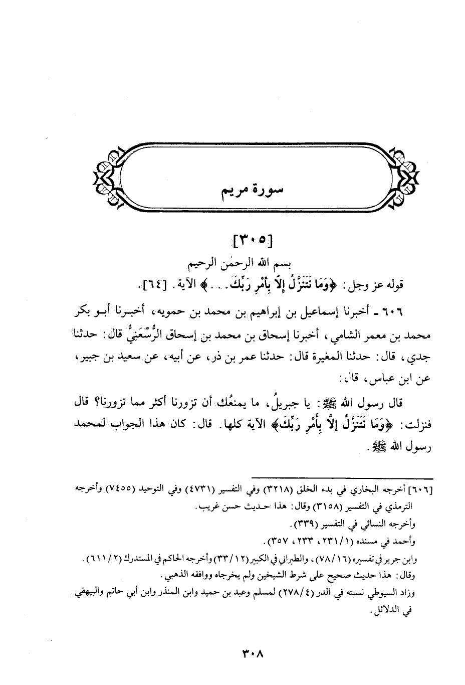 [305] بِسْمِ اللَّهِ الرَّحْمَنِ الرَّحِيمِ قَوْلُهُ عَزَّ وَجَلَّ: وَمَا نَتَنَزَّلُ إِلَّا بِأَمْرِ رَبِّكَ ... الآية. [64] .