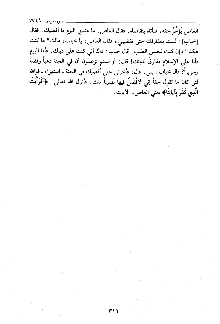 الْعَاصُ يُؤَخِّرُ حَقَّهُ، فَأَتَاهُ يَتَقَاضَاهُ، فَقَالَ الْعَاصُ: مَا عِنْدِي الْيَوْمَ مَا أَقْضِيكَ. فَقَالَ [خَبَّابٌ] : لَسْتُ بِمُفَارِقِكَ حَتَّى تَقْضِيَنِي، فَقَالَ الْعَاصُ: يَا خَبَّابُ، مَا لَكَ؟ مَا كُنْتَ هَكَذَا! وإن كنت لحسن الطَّلَبَ. قال خَبَّابٌ: ذَاكَ أَنِّي كُنْتُ عَلَى دِينِكَ، فَأَمَّا الْيَوْمَ فَأَنَا عَلَى الْإِسْلَامِ مُفَارِقٌ لدينك! قال: أو لستم تَزْعُمُونَ أَنَّ فِي الْجَنَّةِ ذَهَبًا وَفِضَّةً وَحَرِيرًا؟ قَالَ خَبَّابٌ: بَلَى، قَالَ: فَأَخِّرْنِي حَتَّى أَقْضِيَكَ فِي الجنة- استهزاء- فو اللَّه لَئِنْ كَانَ مَا تَقُولُ حَقًّا إِنِّي لَأَفْضَلُ فِيهَا نَصِيبًا مِنْكَ. فَأَنْزَلَ اللَّهُ تَعَالَى: أَفَرَأَيْتَ الَّذِي كَفَرَ بِآيَاتِنَا يَعْنِي الْعَاصَ، الْآيَاتِ.