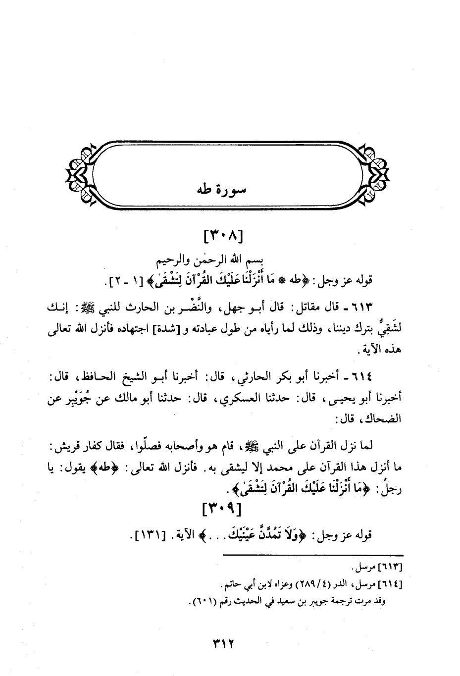[308] بِسْمِ اللَّهِ الرَّحْمَنِ والرحيم قَوْلُهُ عَزَّ وَجَلَّ: طه مَا أَنْزَلْنَا عَلَيْكَ الْقُرْآنَ لِتَشْقَى [1- 2] .