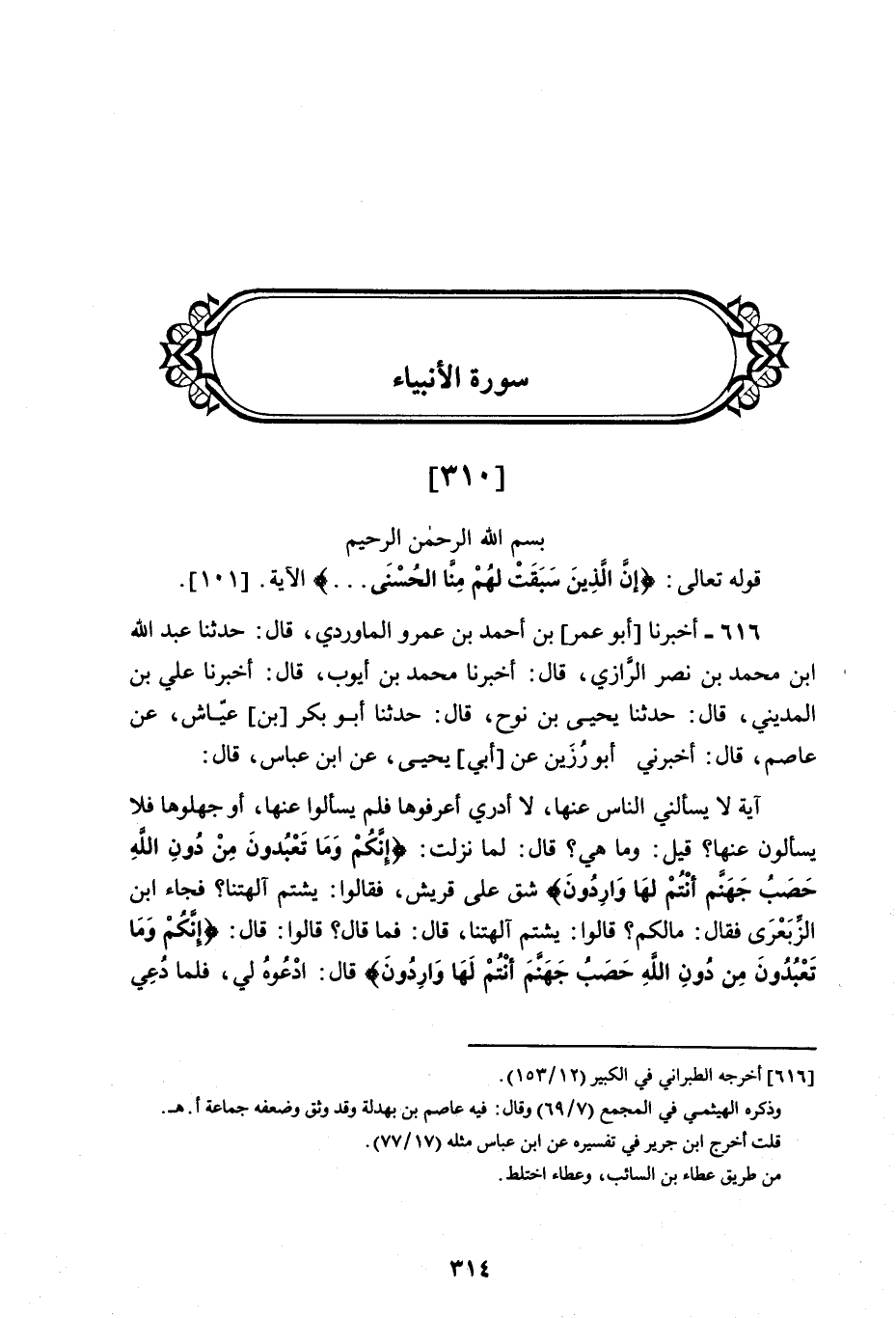 [310] بِسْمِ اللَّهِ الرَّحْمَنِ الرَّحِيمِ قَوْلُهُ تَعَالَى: إِنَّ الَّذِينَ سَبَقَتْ لَهُمْ مِنَّا الْحُسْنى ... الآية. [101] .